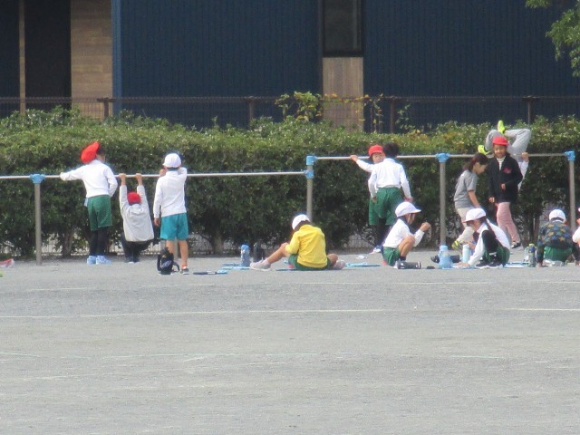2年1組が運動場で、鉄棒の学習をしていました。いろいろな技を教師や友達の前で披露していました。