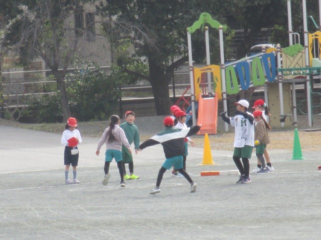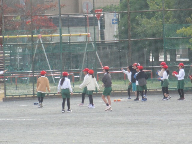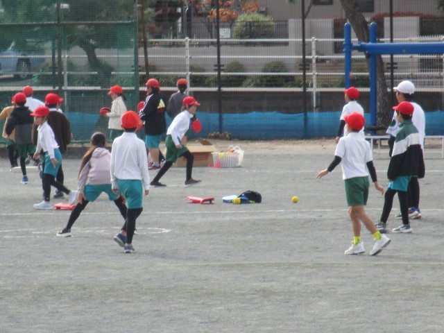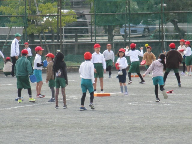 4年2組が運動場で、ボール運動をしていました。ボールを打った子はコーンまで一生懸命走り、守っている子はボールを真剣に追いかけていました。