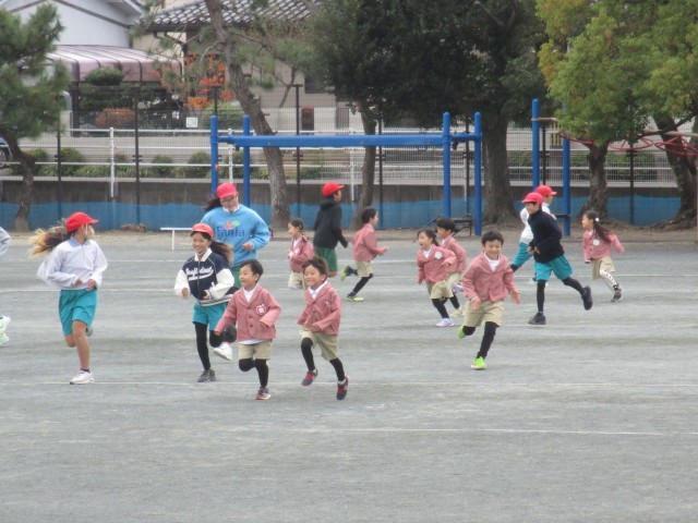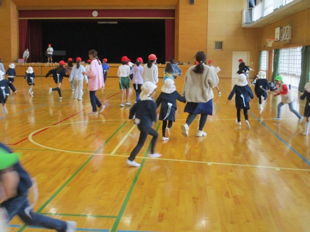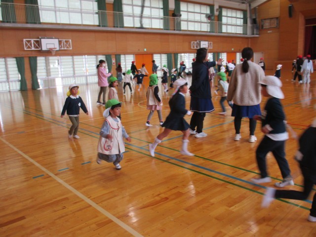 1年生の交流に続いて、来年のペアになる5年生が園児と交流しました。5年生は、さすが高学年らしく園児の気持ちや様子を考え今日に至るまで計画を練ってきました。5年3組は体育館で、5年4組は運動場で、一緒に体を動かしながら楽しく交流していました。