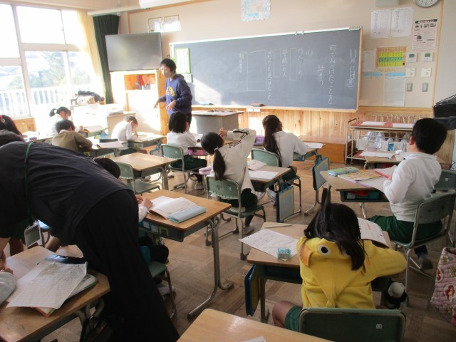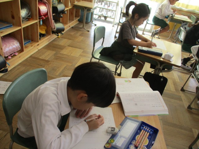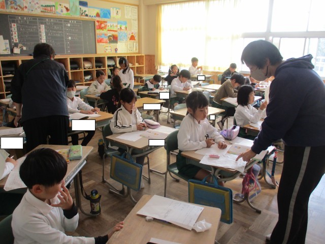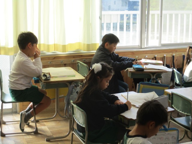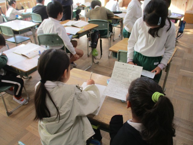 2年1組では、「町で見つけたことを話そう」の学習をしていました。先日町探検に行ったときに見たものを思い出しながらメモを作っていました。