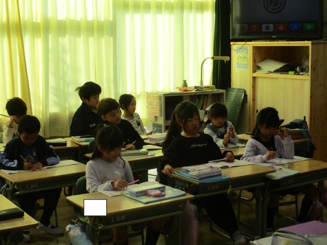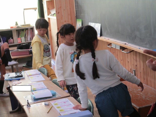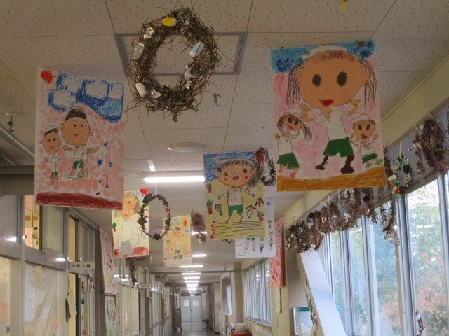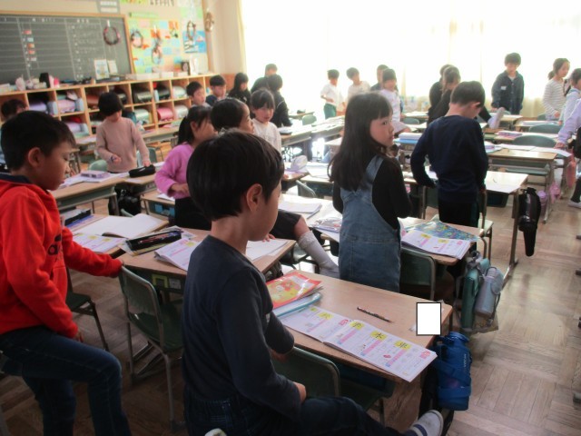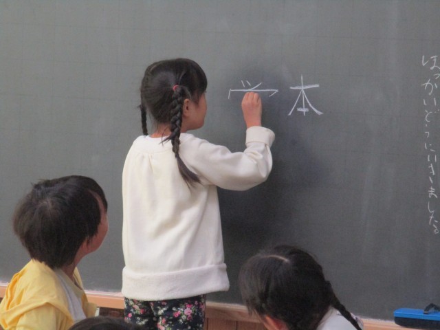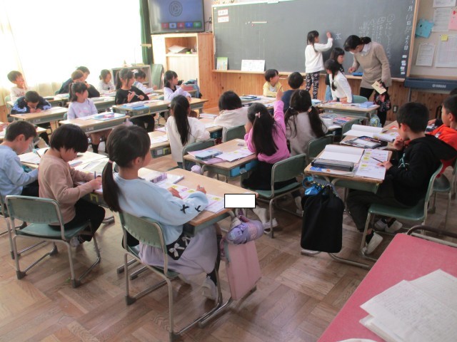 1年2組の廊下には、素敵な作品が飾られています。教室の中では、子どもたちが新しい漢字を習っていました。友達が黒板に書いた文字の筆順を確認した後、体を使って空書きをしていました。