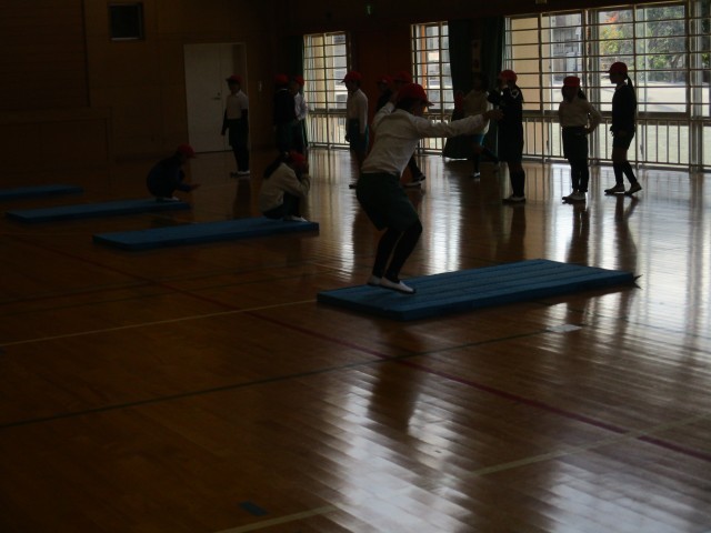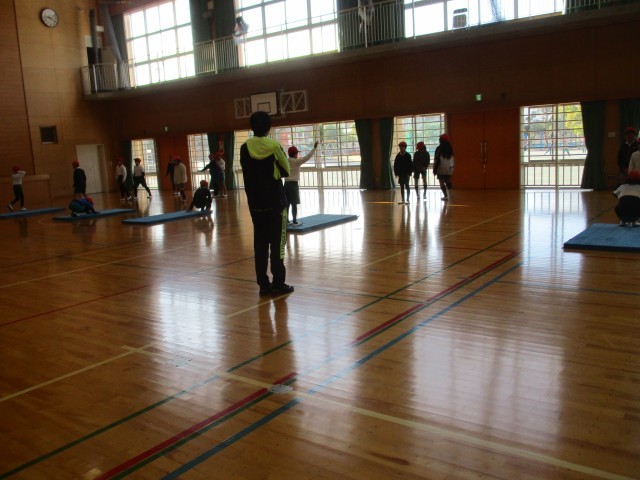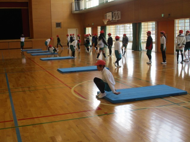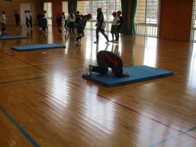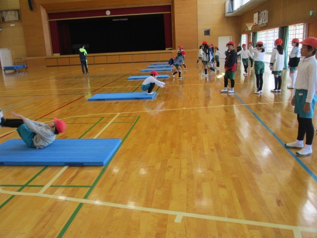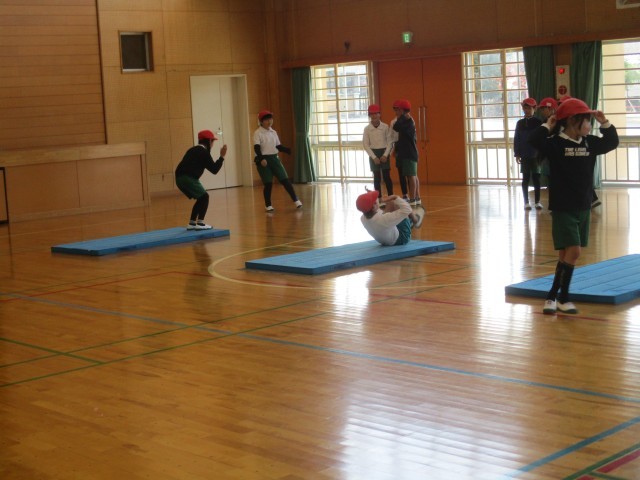 4年3組が体育館でマット運動を行っていました。前転や後転など自分が挑戦したい技を決めて練習していました。スムーズに回るために教師のアドバイスを聞きながら一生懸命取り組んでいました。