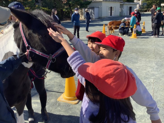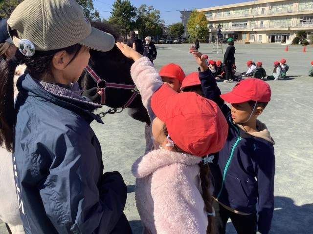後半はサラブレッド、ポニー、ミニチュアポニーと触れ合いをしました。
