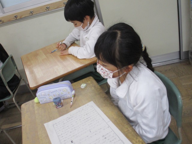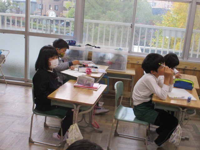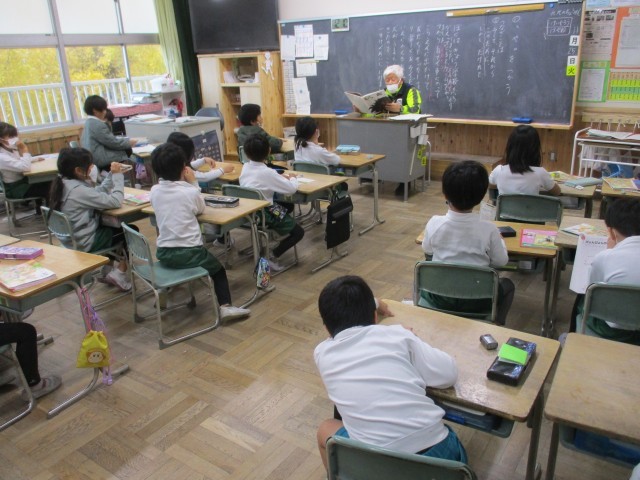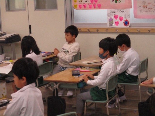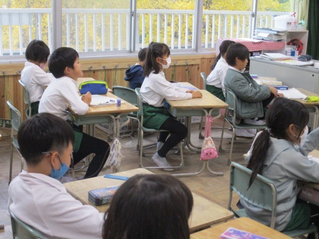 2年4組では、作文の学習を終え、教師による「八郎」の読み聞かせを行っていました。心を打たれるストーリーにみんな真剣に絵本や教師を見つめていました。