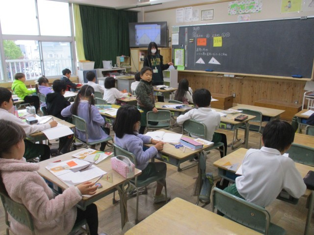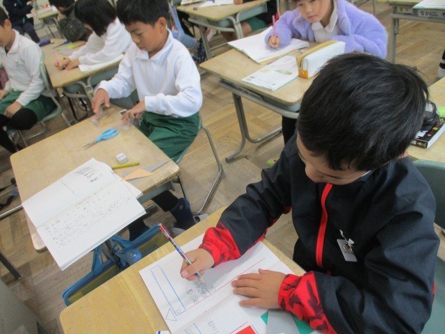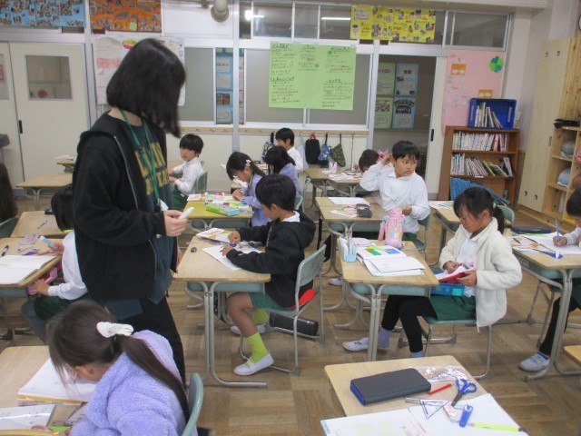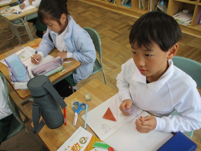 2年3組では、形の名前と特徴を学習していました。大事な言葉をノートにまとめた後、折り紙で作った三角形をノートに貼っていました。