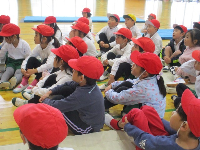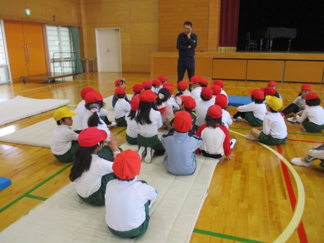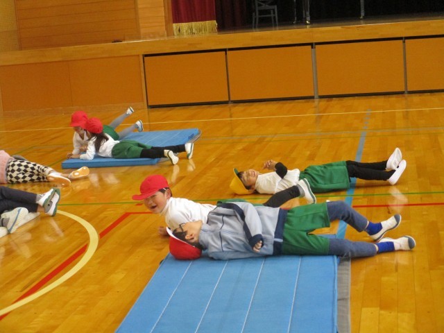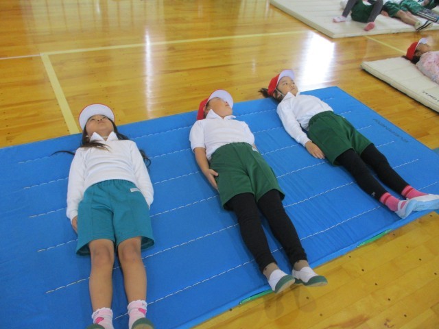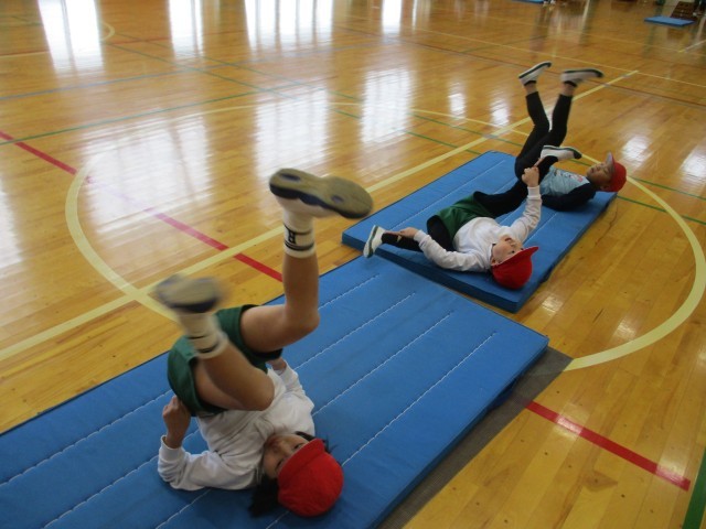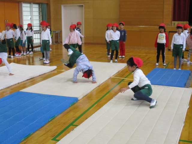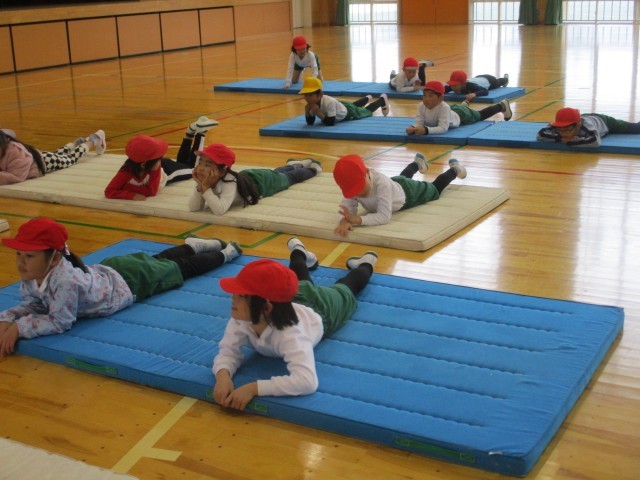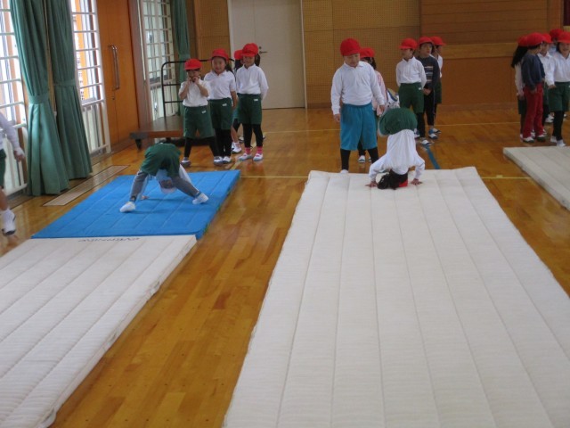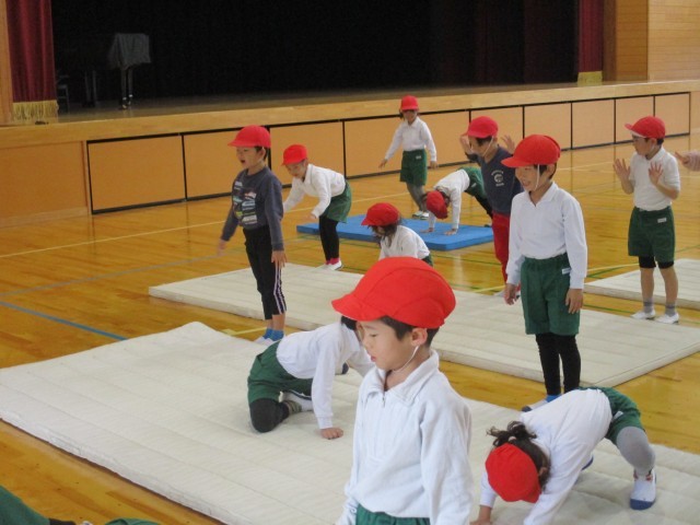 1年1組が体育館で、マット遊びを行っていました。みんなで体を転がしたり足を上にあげて広げたりした後、連続技に挑戦していました。
