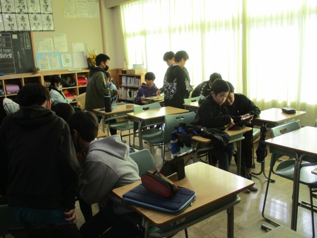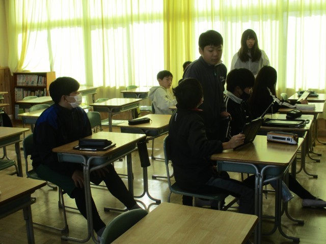 6年生がクラスを解体して4つの教室に分かれて調べ学習や発表の準備をしていました。各クラスの様子を写真でお伝えします。