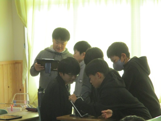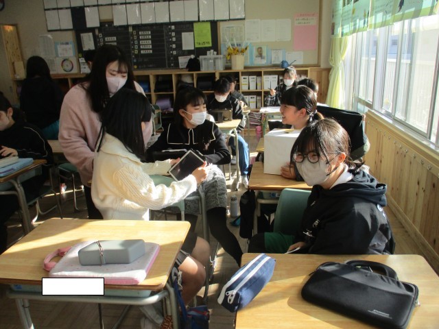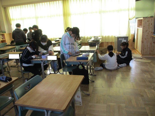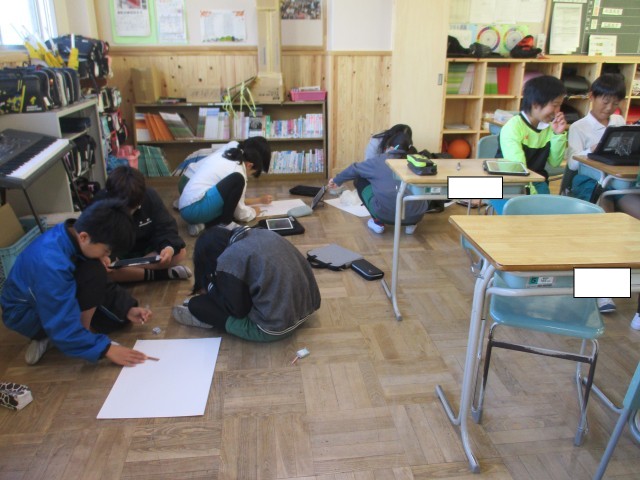 6年生がクラスを解体して4つの教室に分かれて調べ学習や発表の準備をしていました。各クラスの様子を写真で伝えます。