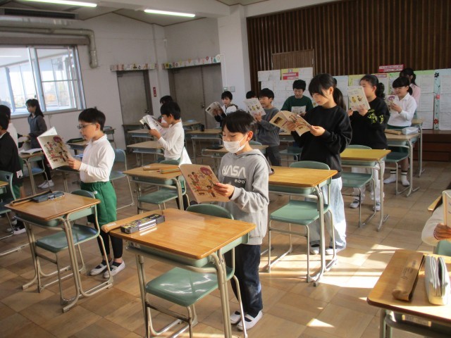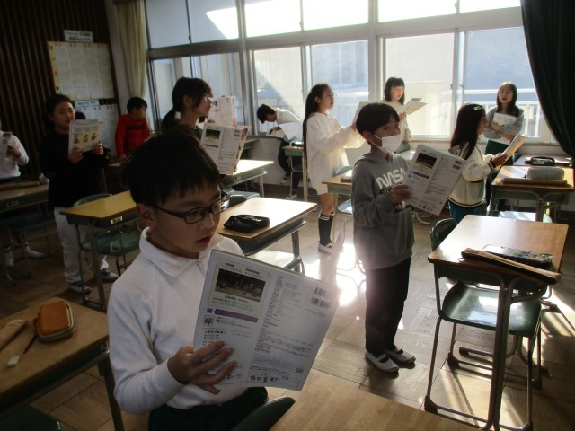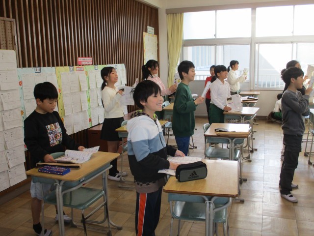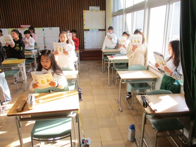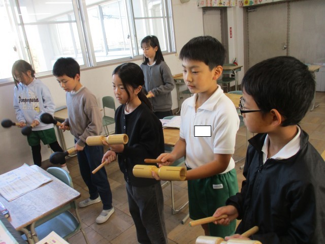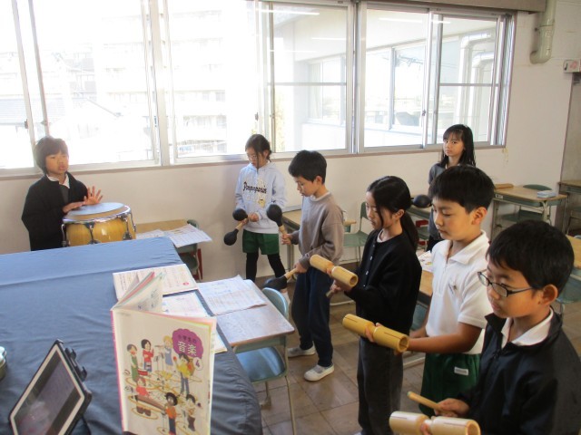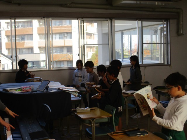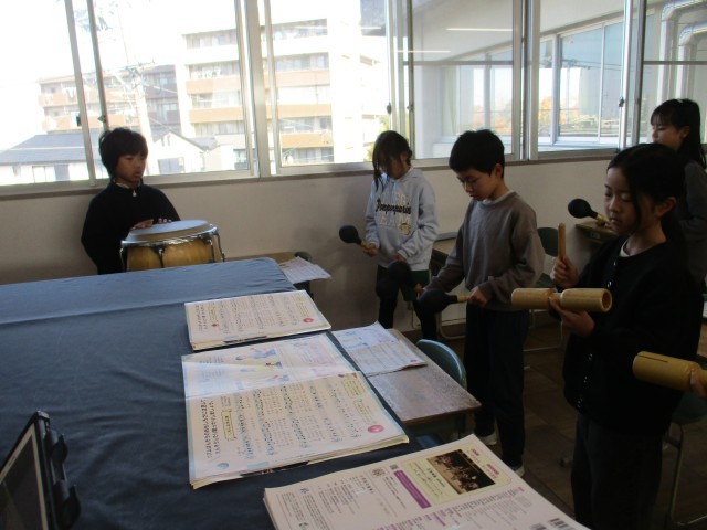 4年4組が音楽室で「いろいろな木の実」の学習をしていました。歌を歌う子とリズム打ちをする子に分かれて合奏&合唱をしていました。みんな楽しそうに歌ったり楽器を鳴らしたりしていました。