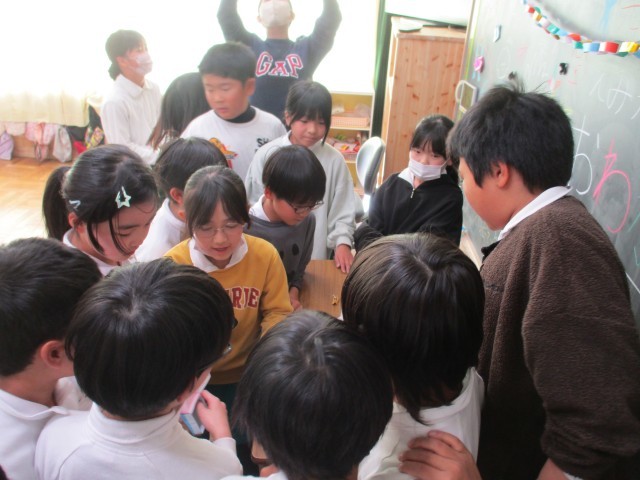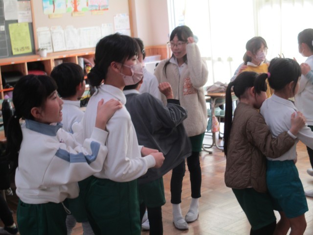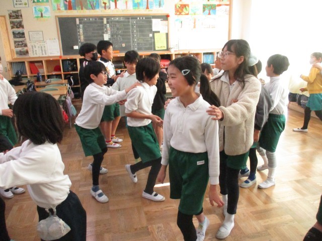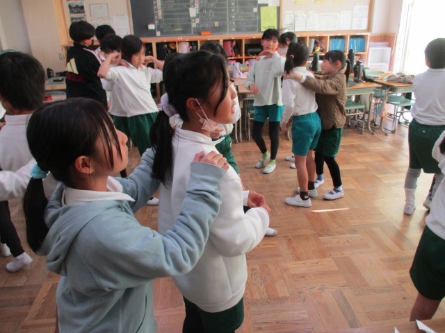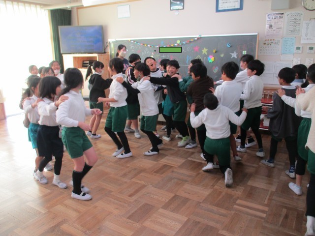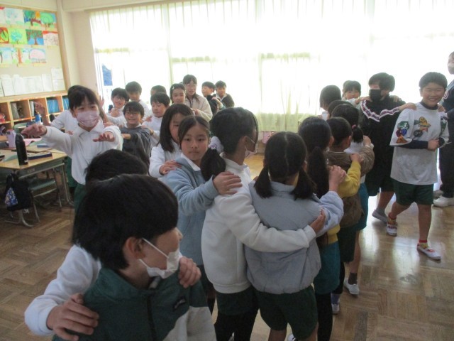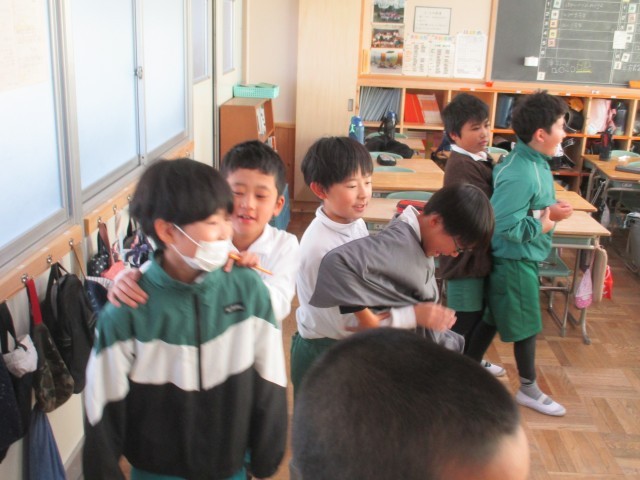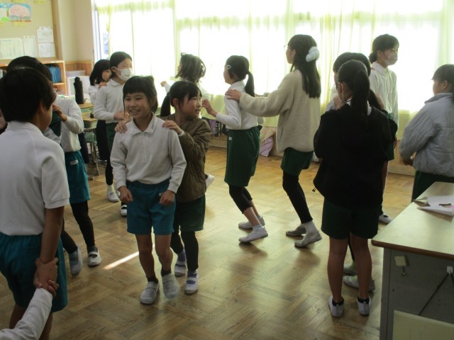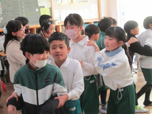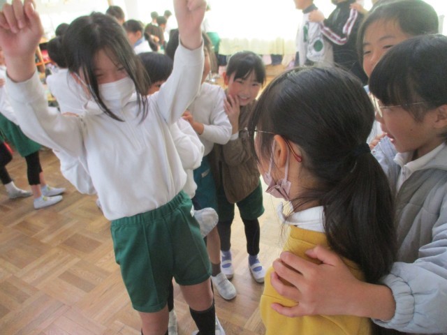 4年2組では、お別れ会でじゃんけん列車をしていました。じゃんけんをするたびにあちこちから歓声が上がりとても楽しそうでした。じゃんけん列車のチャンピオンには、折り紙の景品が渡されていました。転校する子も送り出す子も思い出に残る楽しいひとときにになりました。