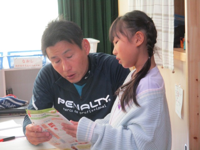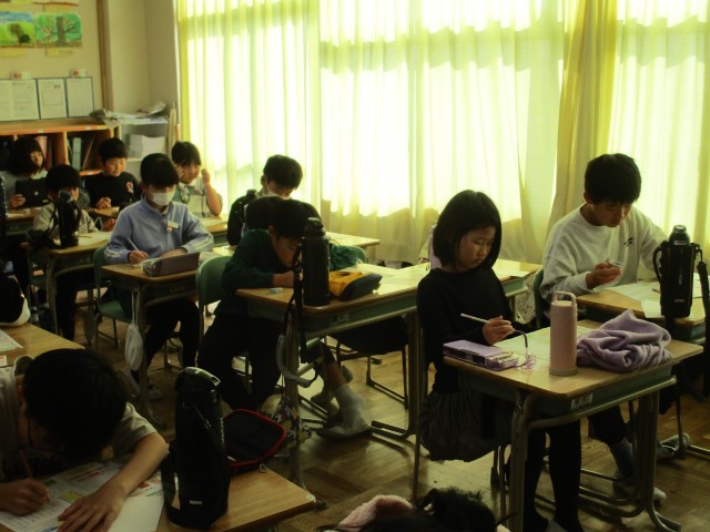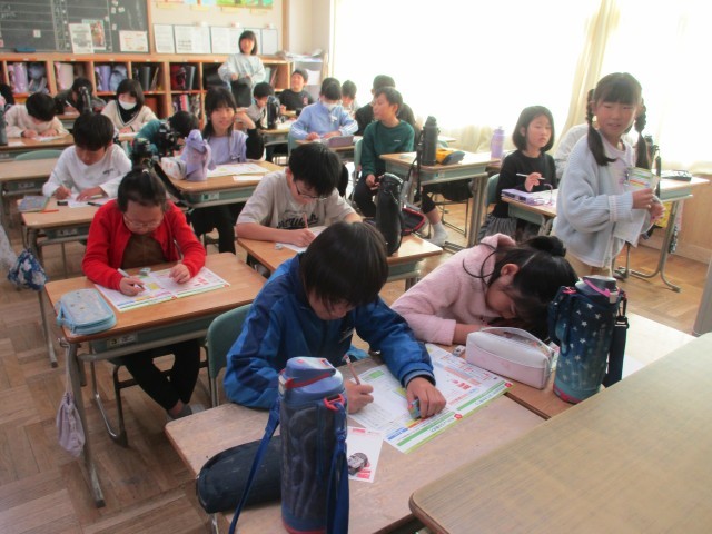 4年1組では、年賀状の書き方を学習していました。子どもたちから文に〇をつけるのかつけないのかと質問が出ると、教師が一般的につけないことも多いと答えていました。丁寧な字で頑張って書いていました。
