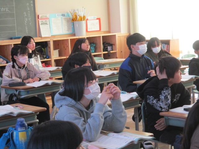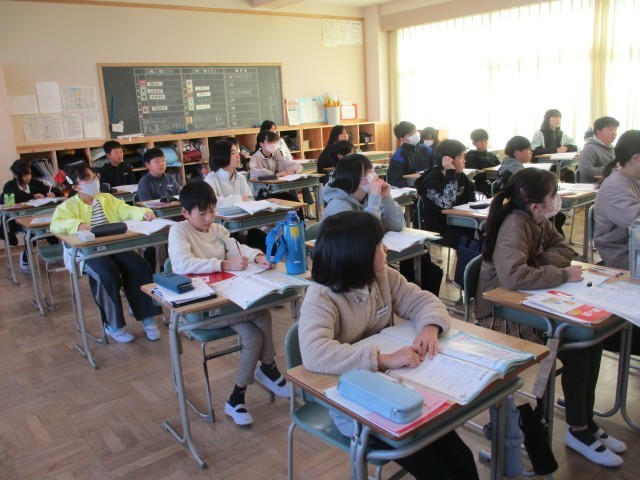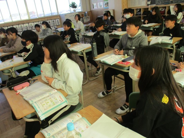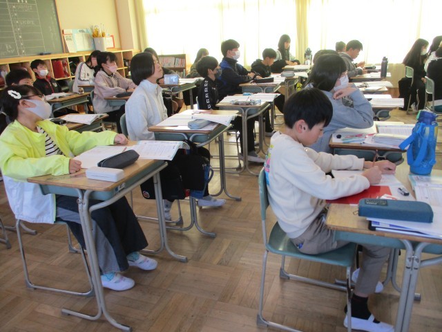 6年1組では、算数で「ともなって変わる二つの量」について学習していました。噴水やラーメンの湯で時間など身近なところに関数が使われていることを教師が語ると、子どもたちは興味津々で聞いていました。
