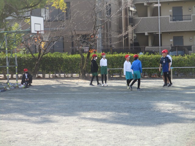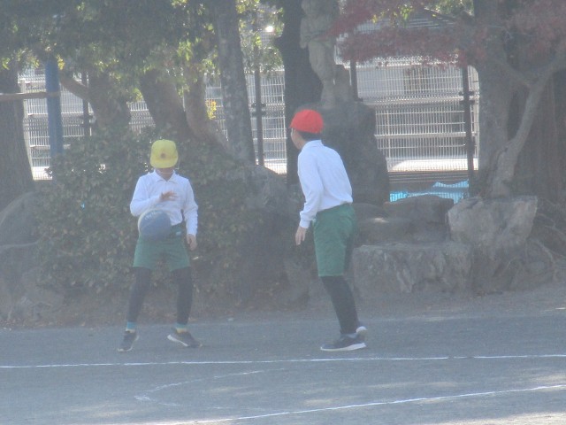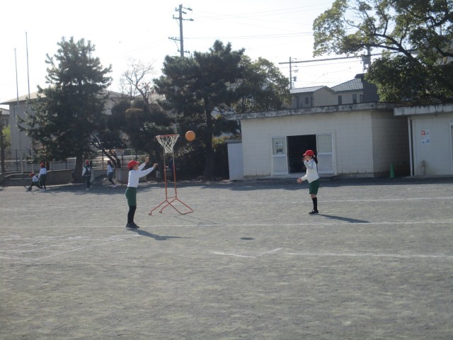 5年2組が運動場でボールパスやドリブル、シュートの練習をしていました。グループでボールを回しながら活動に取り組んでいました。