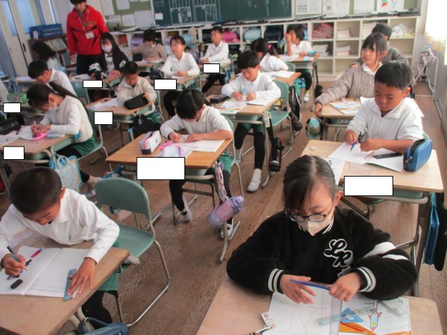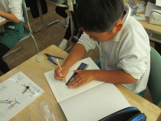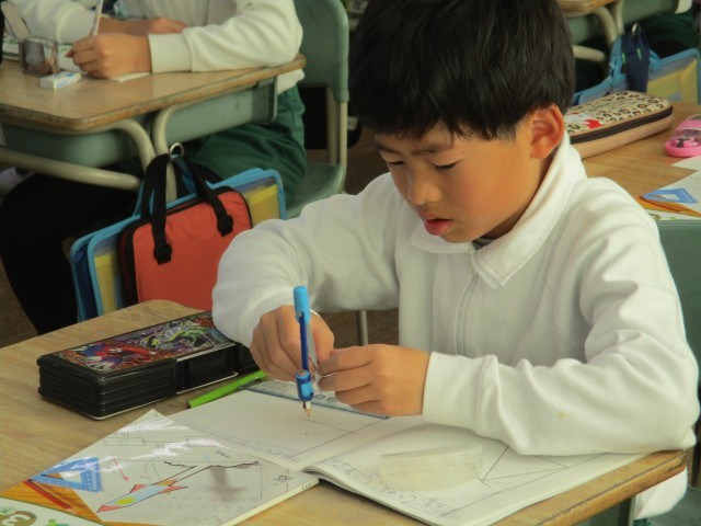 3年3組では、三角形をコンパスや定規を使ってかいていました。辺の長さが決まっているときどうかいたらよいか確認してからノートにかきました。