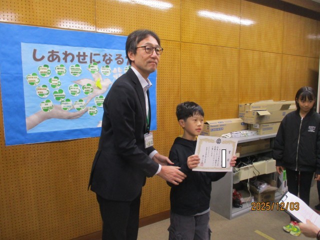 表彰が終わると、校長先生のお話です。明日から始まる「人権週間」にちなんで、「人権」についてのお話がありました。最後に表彰を受けた6年生とのやり取りを通して、人権週間のポスターの絵が「花」と「鳥」の両方に見ることに気づいた後、「低学年は『気づくこと』を目標に、相手がいろいろな気持ちがあることに気づきましょう。高学年は『察すること』を目標に、相手を見てどんな気持ちか察してあげられるようになりましょう。相手が自分のことを考えてくれるのはうれしいものです。いつもに増して人のことを考える1週間にし、毎日を『しあわせ』に過ごしましょう。」というお話を子どもたちは真剣に聞いていました。