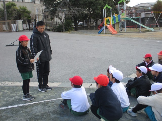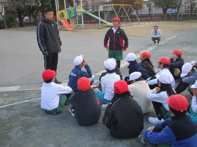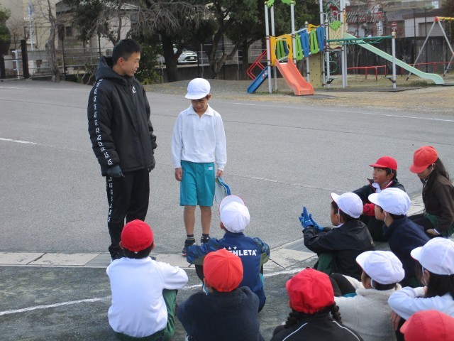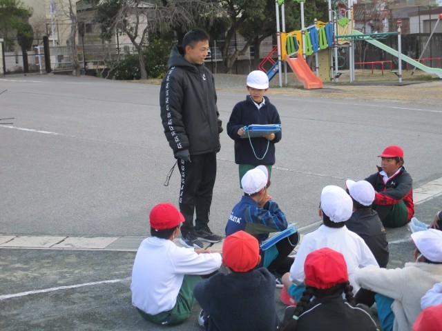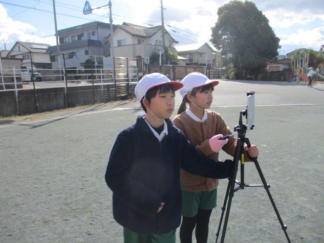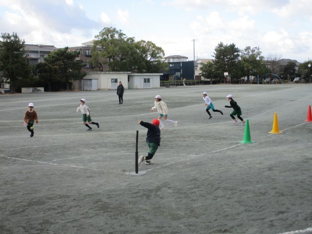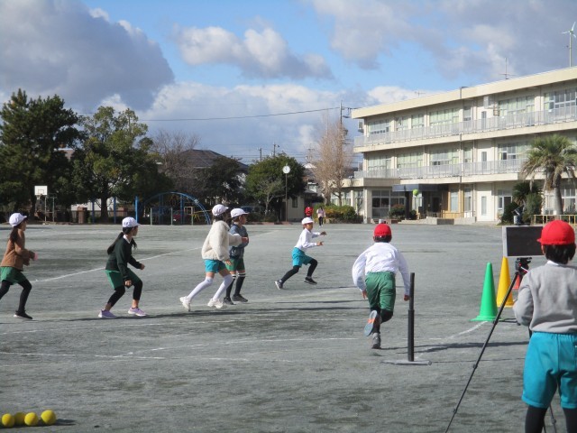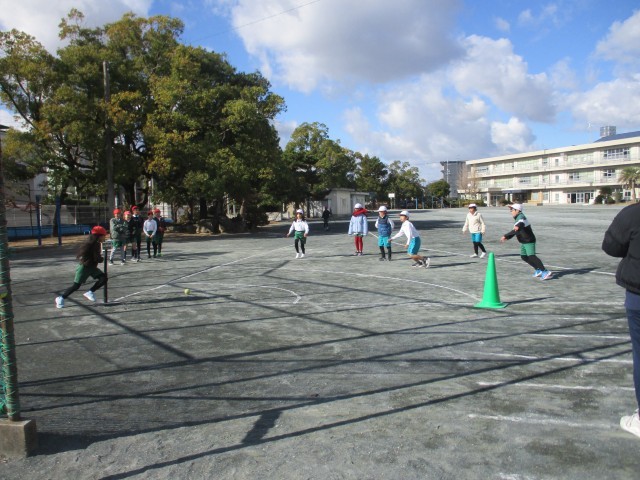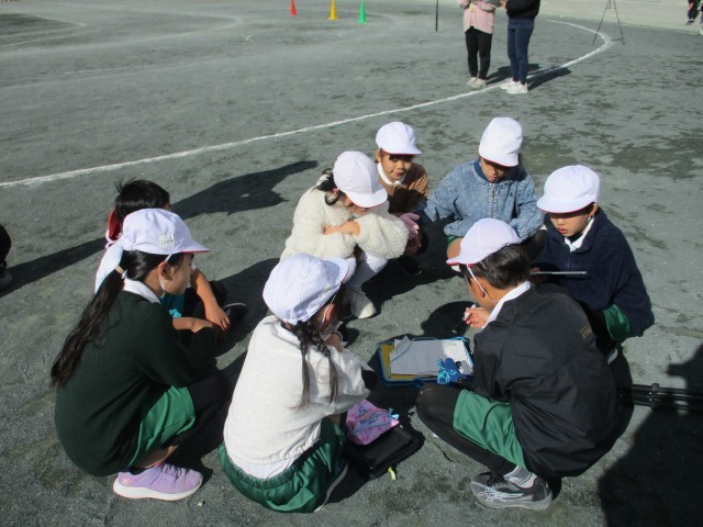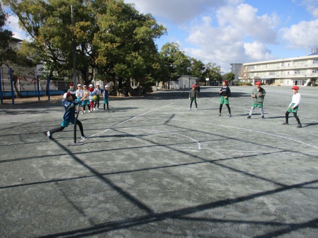 4年3組が運動場で、「ハンドベースボール」の学習で研究授業を行っていました。教師の話を聞くと、素早く準備を済ませ、試合をスタートさせました。試合では、自分たちのグループで決めためあてがきちんとできているか振り返るためにタブレットで友達の攻守の様子を撮影していました。途中、めあてが達成できているかタブレットやズを使って振り返り、よりレベルアップするための作戦を考えました。2試合目が終わると次の時間に生かすために振り返りの結果を発表し合いました。みんな、ルールを守って楽しく活動していました。