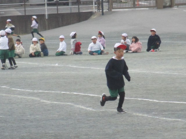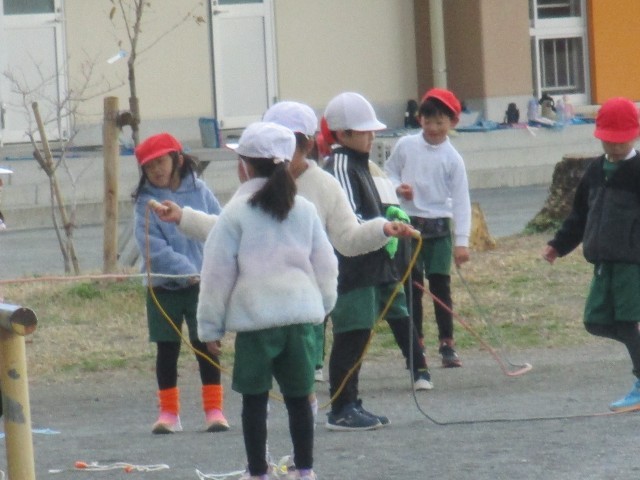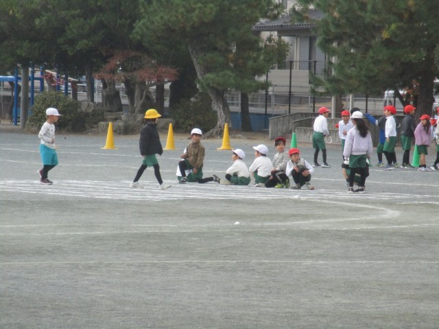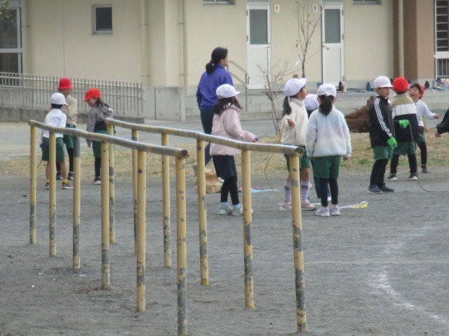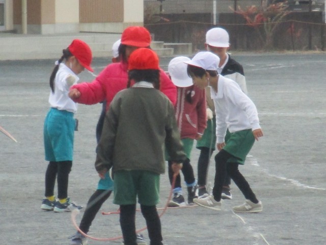 1年1,2組が運動場で持久走や縄跳びに取り組んでいました。寒い日ですが、しっかり動くと体が温まっているようでした。