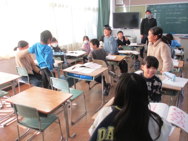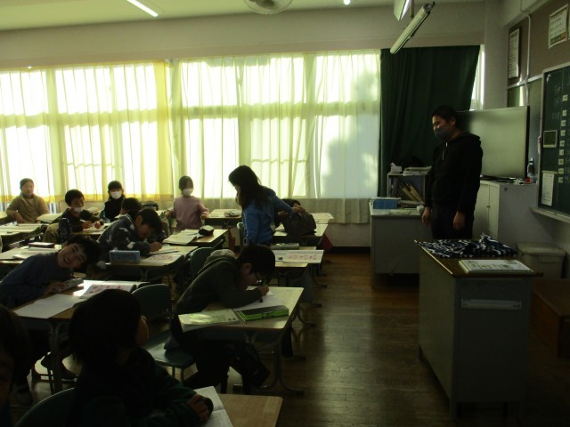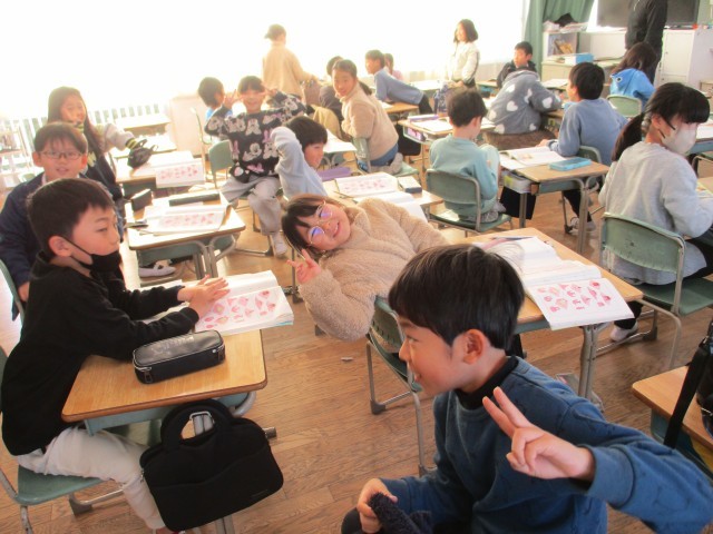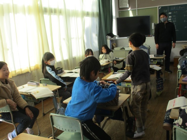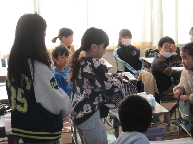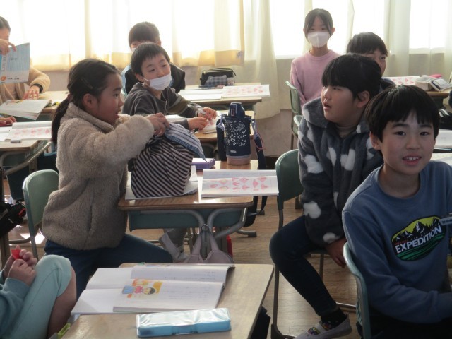 3年1組では、「ふろしき」という教材を読んでいました。風呂敷には折り方でいろいろなものが持てることを知り、実際に教師が用意した風呂敷で物を運ぶ体験をしていました。楽しそうにその便利さを感じていました。