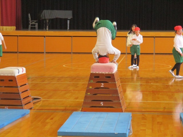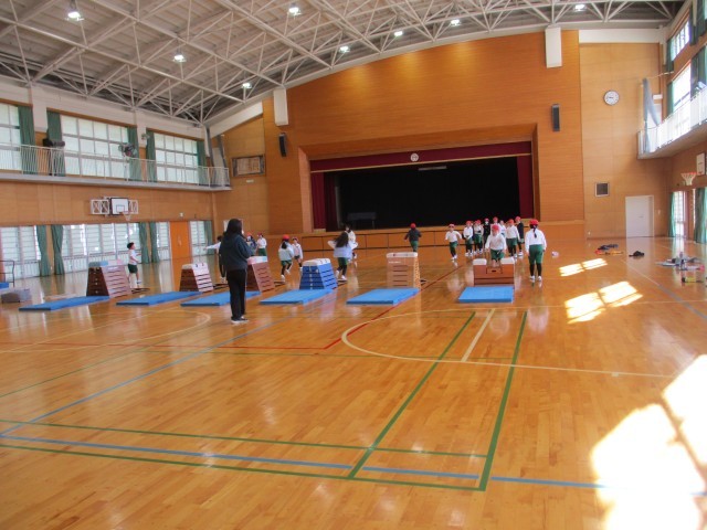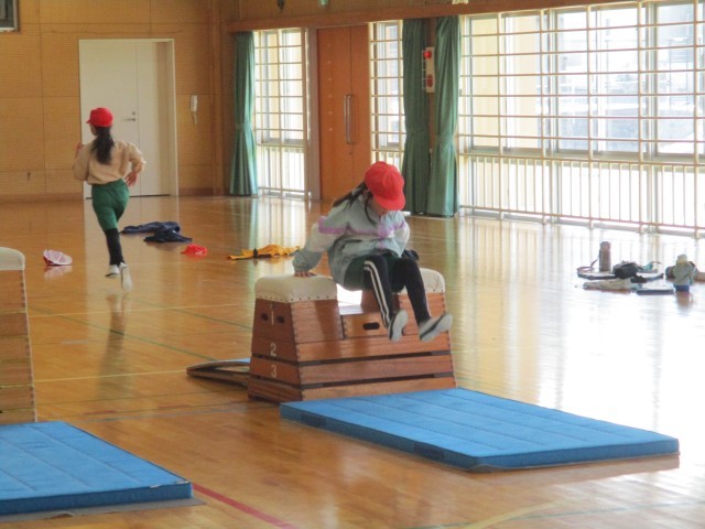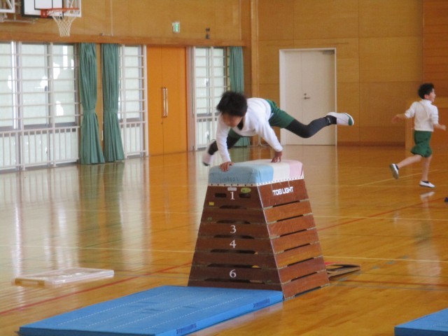 3年4組が体育館で跳び箱の学習をしていました。開脚跳びや台上前転、抱え込み跳びなど自分の目標に合った跳び方で練習していました。
