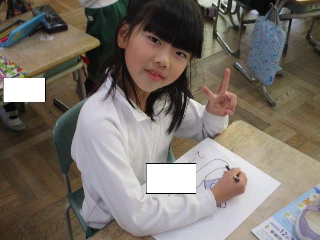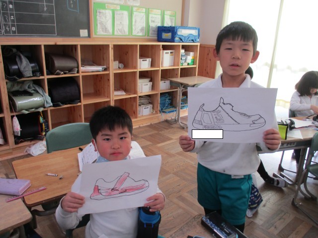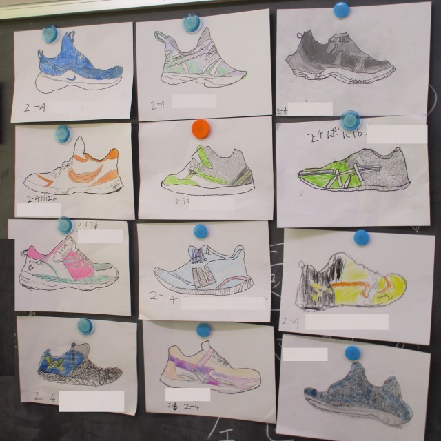 2年4組の黒板に大人が描いたようなクオリティーの靴のスケッチが並んでいました。自分の靴をもってきて輪郭を取り実物を見ながら模様や色付けをしていきました。すばらしい出来栄えにどの子も満足そうでした。