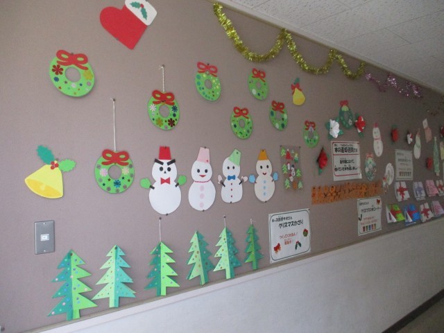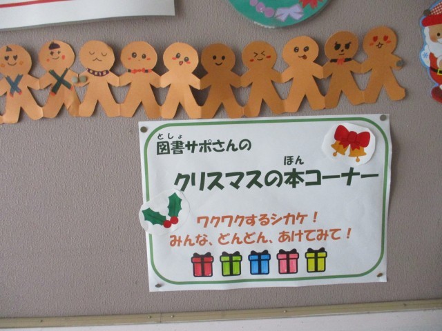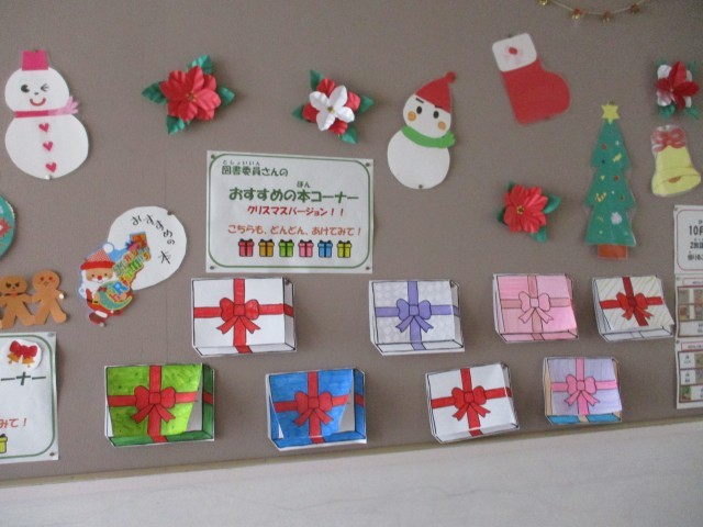 図書コーナーがクリスマスバージョンになっています。図書サポーターさんが作ったプレゼント風のおすすめの本コーナーもあって、読んでみたくなりました。