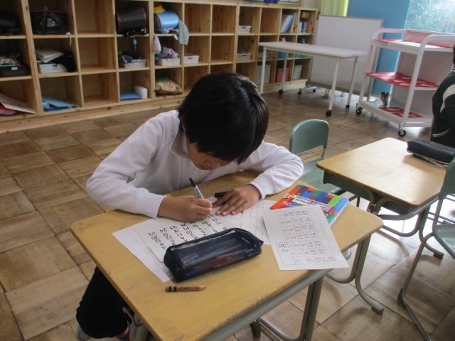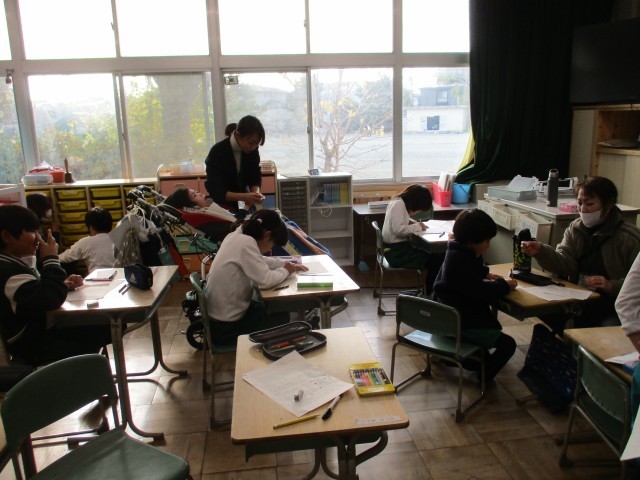 いずみ学級では、カレンダーづくりに取り組んでいました。丁寧に数字を書き、教師にチェックしてもらっていました。子どもたちは真剣に取り組んでいました。