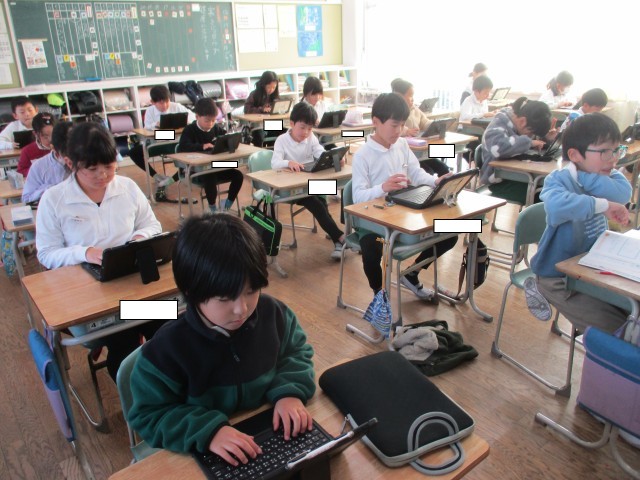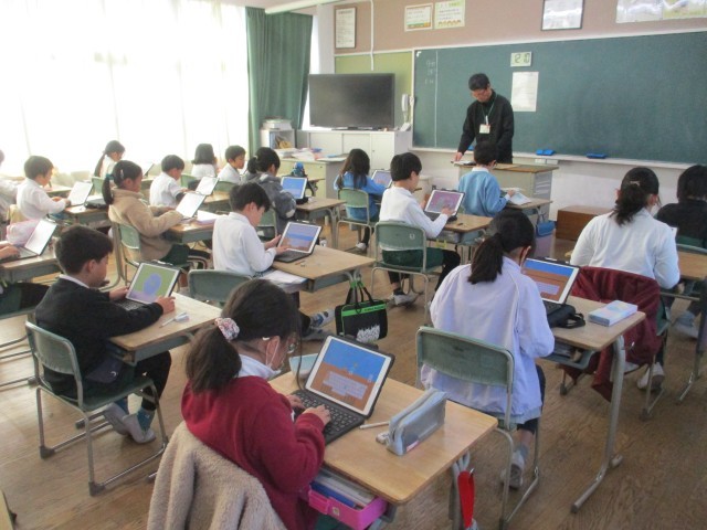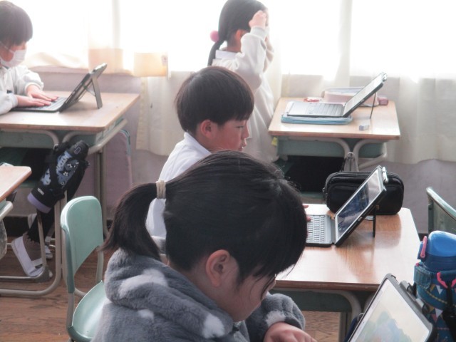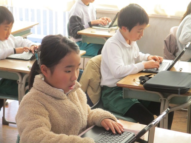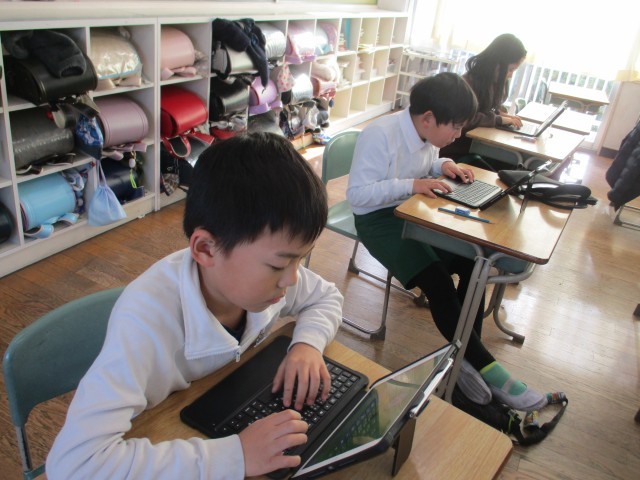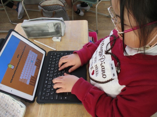 3年1組では、習ったローマ字を習得するため、タブレットのローマ字アプリに取り組んでいました。夢中になってキーボードを打っていました。