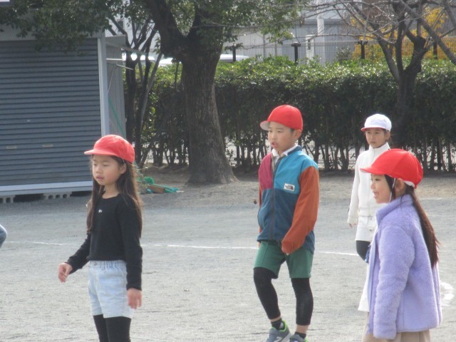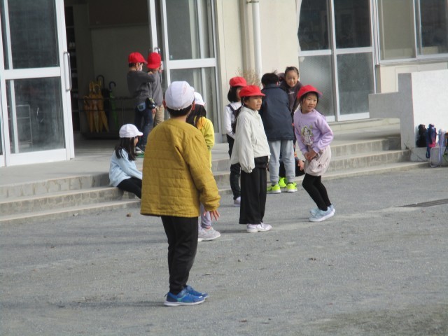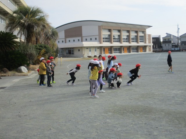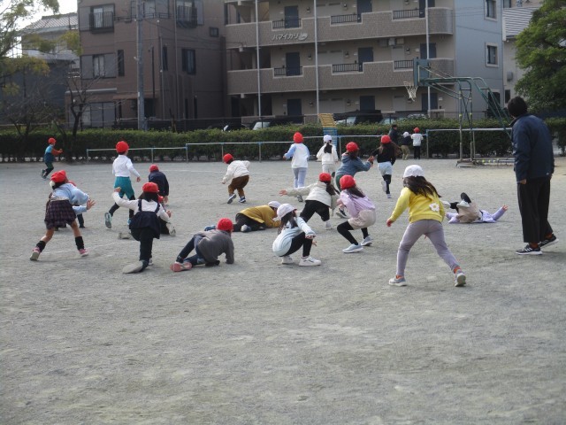 2年1組が運動場で「だるまさんがころんだ」をやっていました。みんな楽しそうに動いていました。