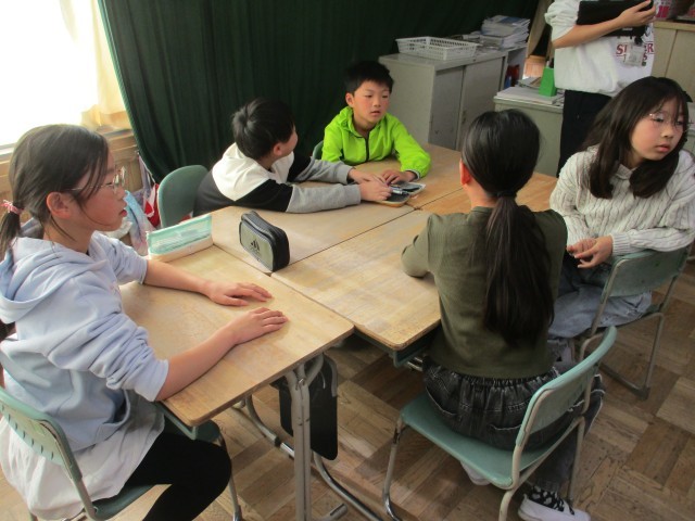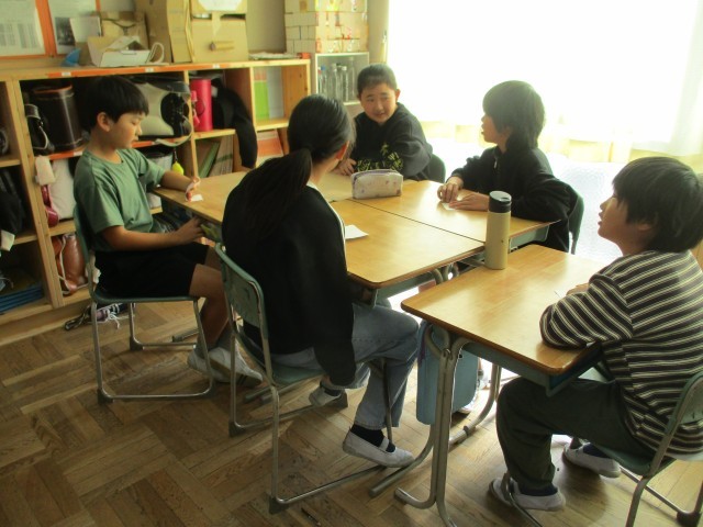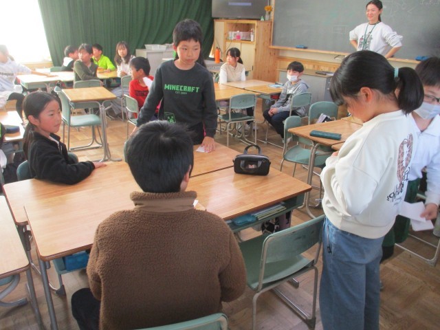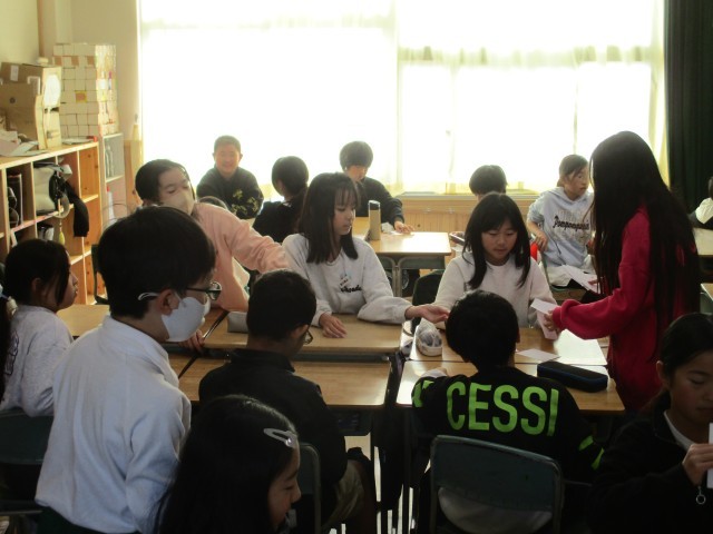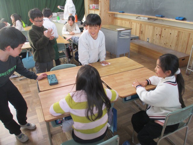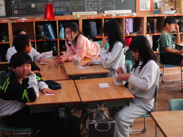 4年4組では、お楽しみ会が行われていました。ゲームの係の子が班にカードを配り準備をしていました。待っている子はわくわくした顔をしていました。