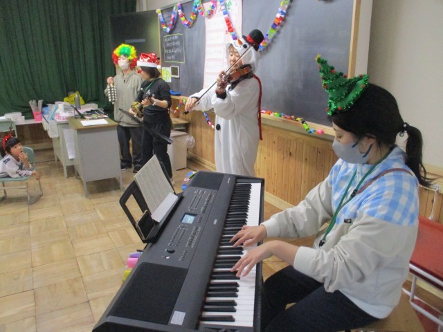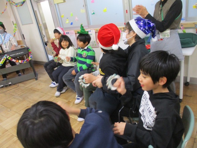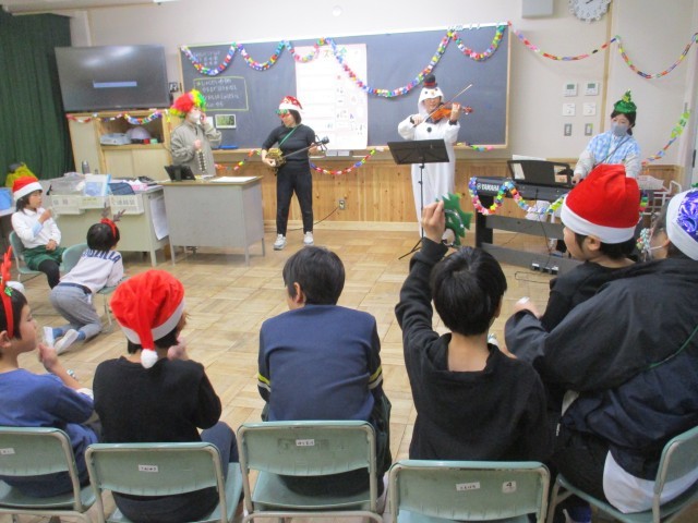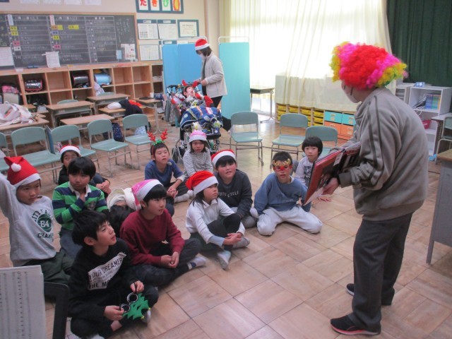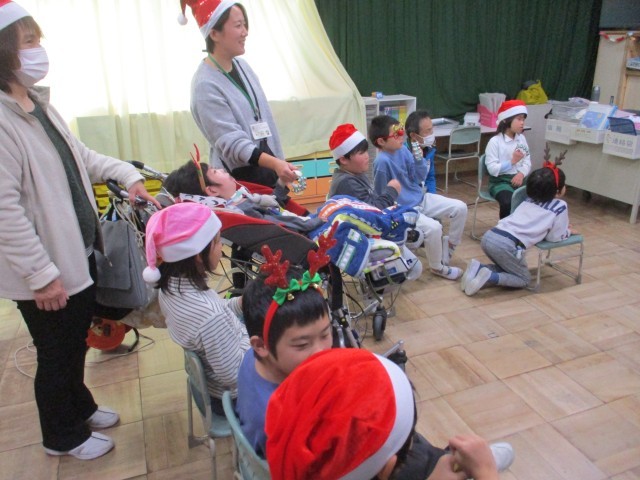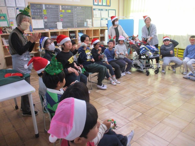 いずみ学級では、お楽しみ会を行っていました。読み聞かせを聞いたり、教師やスクールアシスタントの生演奏に鈴を鳴らしたりして楽しんでいました。