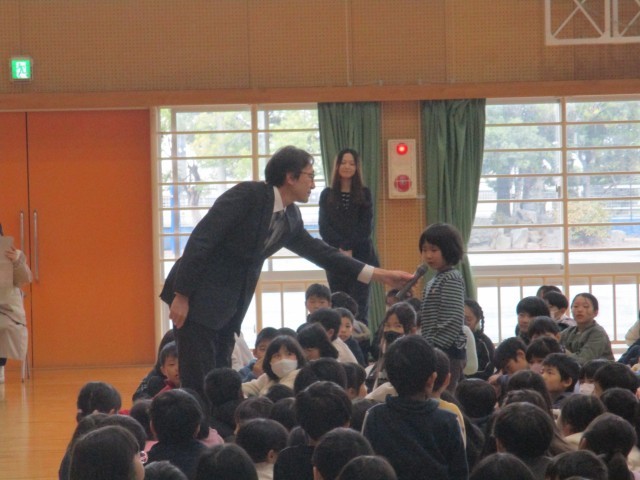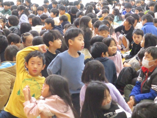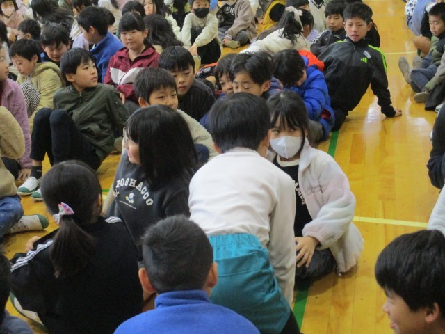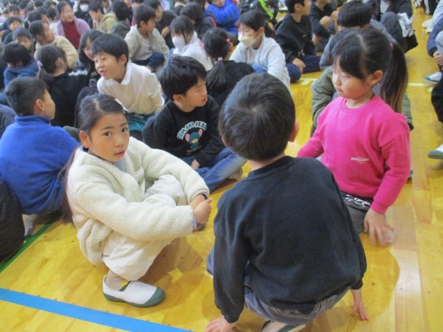 校長先生のお話がありました。代表の子にしっかり話せたことを褒められました。その後、ある子の作文を読んでその子のしあわせをみんなで考えました。どんなことにもどんなときにもしあわせや楽しいことはたくさんある、校歌にも「たのし安城北部校」という歌詞がある、しあわせや楽しいことがたくさんある冬休みにしてほしいというお話でした。高学年には、宿題で「しあわせ」「楽しい」の同じところや違うところを考えてみようと話されました。