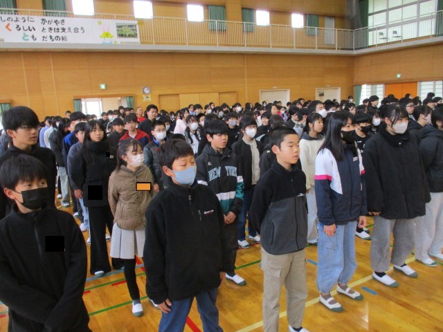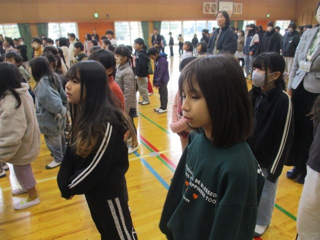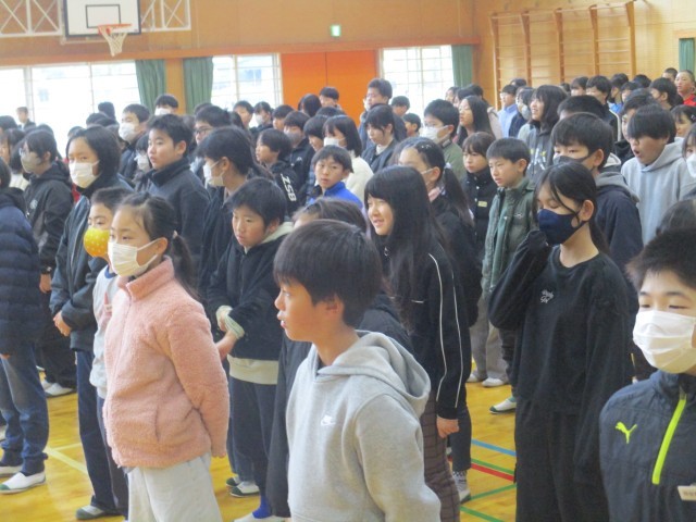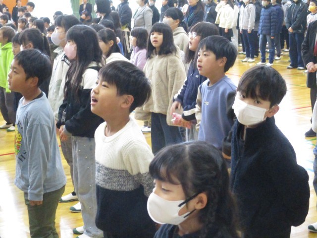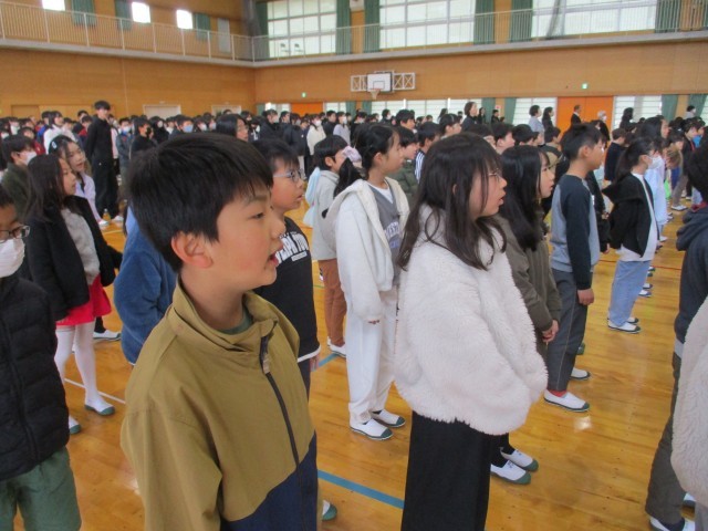 校長先生のお話がありました。代表児童の話を踏まえて、「一人一人それぞれが目標を持っていると思います。素敵な3学期になるようにしましょう」という話をされました。また、教員の一人に聞いた目標「みんなで楽しく過ごしたい」や校長先生の目標「一人一人が幸せな毎日を送れるといい。そのために、自分だけでなくみんなのことを考えられるとよい」という話もありました。