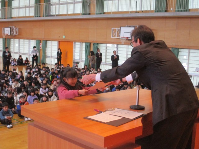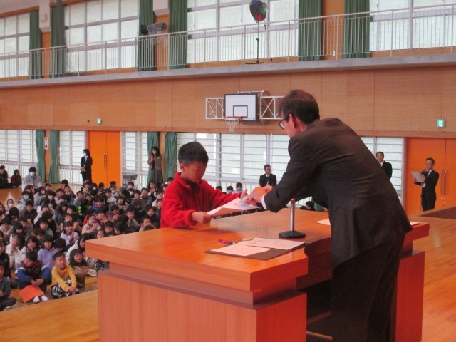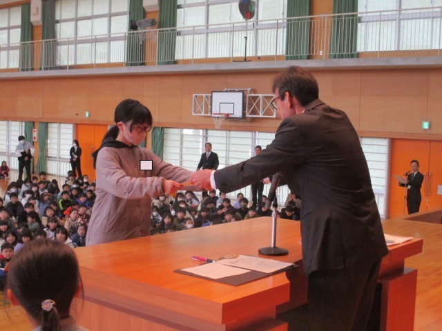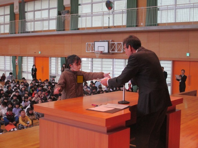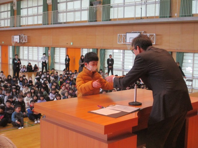 健全育成会啓発作品の表彰が行われました。みんなしっかり校長先生の目を見て賞状を受け取っていました。