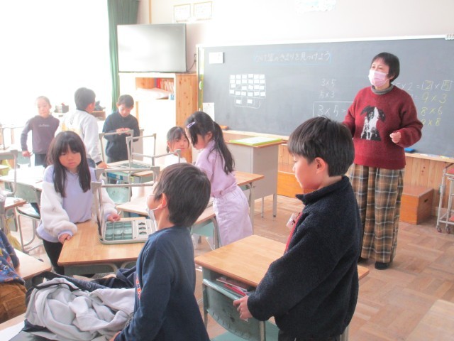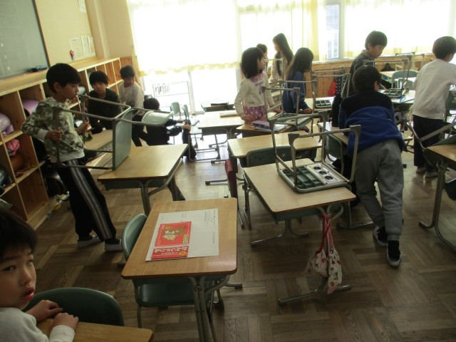 2年1組では、席替えをしていました。黒板に貼られた名前のマグネット見ながら机を動かしていました。どの友達と隣同士になるかわくわくした表情で机を運んでいました。