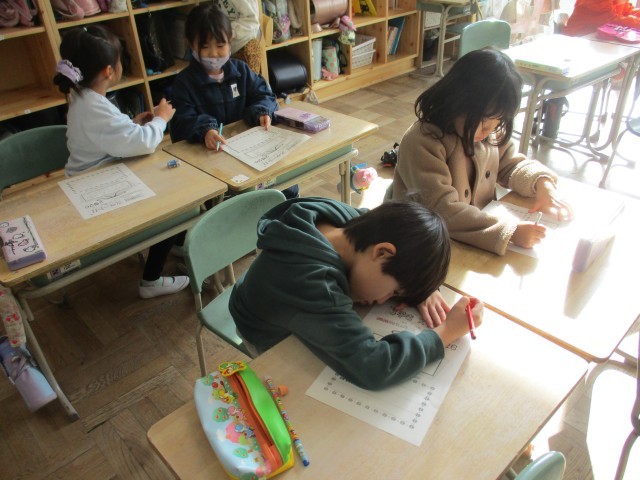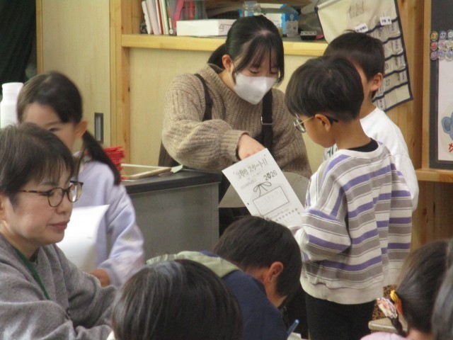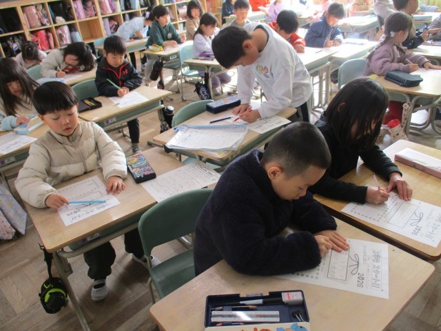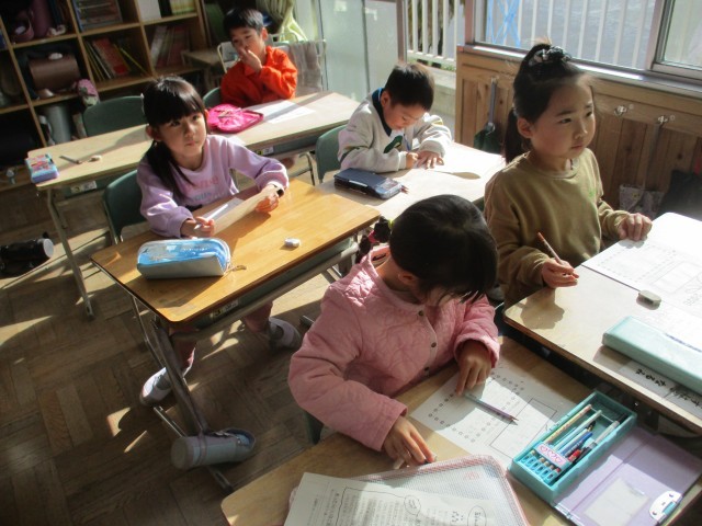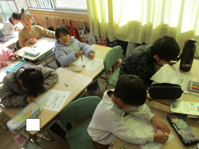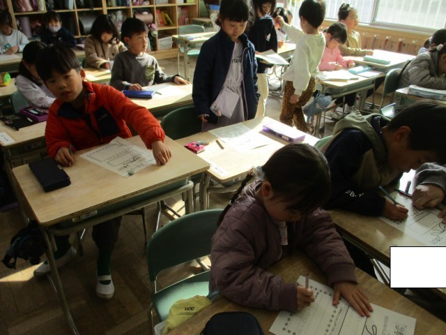 1年3組では、3学期のめあてを書いていました。「さんすう」「かんじ」「なわとび」などそれぞれの目標をカードに書いていました。