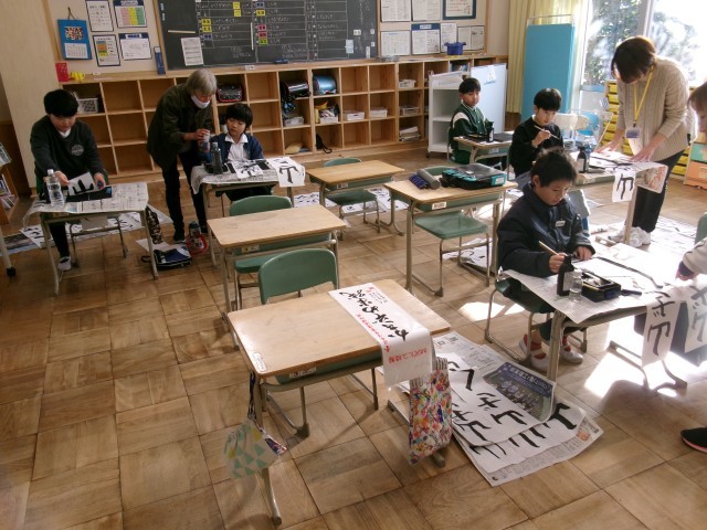 書き初め会が行われました。「春の海」が流れる中、全校児童が冬休みに練習した成果を出そうと、真剣に取り組んでいました。各クラスの様子を写真でお伝えします。