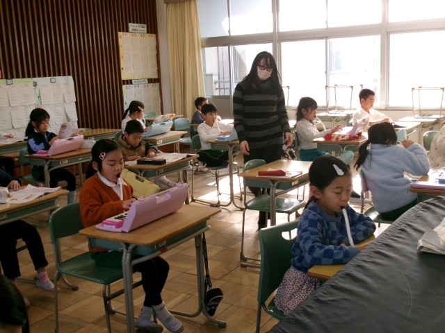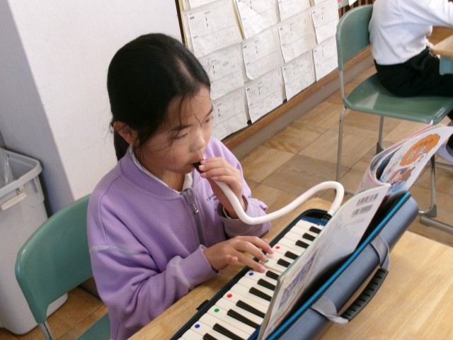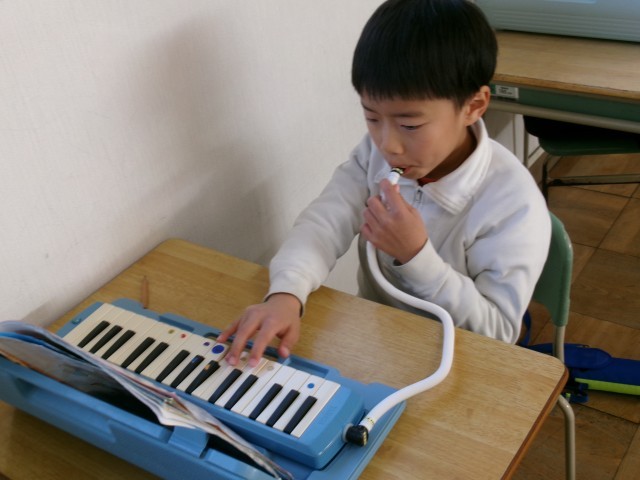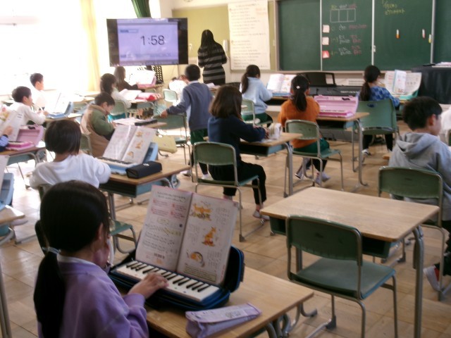2年2組が音楽室で、「こぎつね」の曲を鍵盤ハーモニカで練習していました。指遣いに気を付けながらリズムをとって一生懸命取り組んでいました。