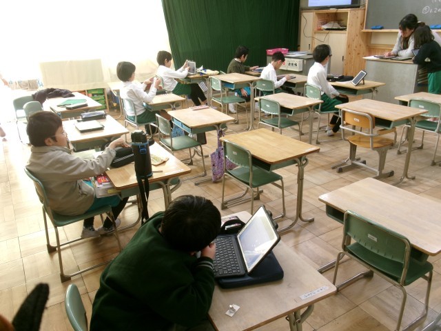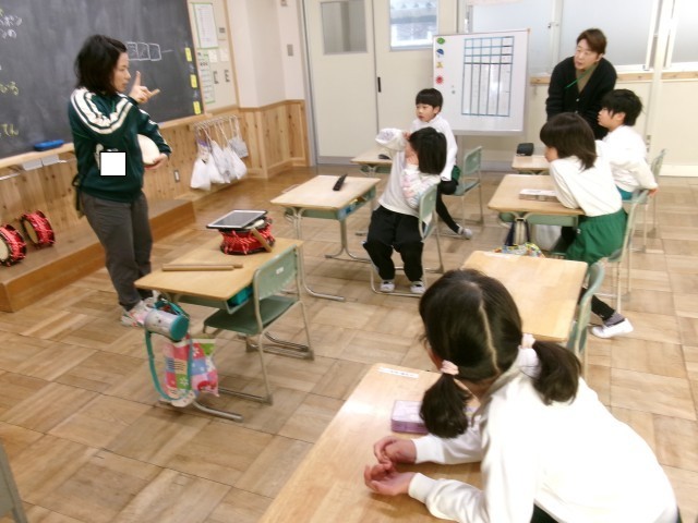 いずみ学級では、3年生以上の子がフォームズのアンケートに答えていました。教師の話を聞いて選択肢を選んでいました。1,2年生は、学期を使う順番を決めていました。