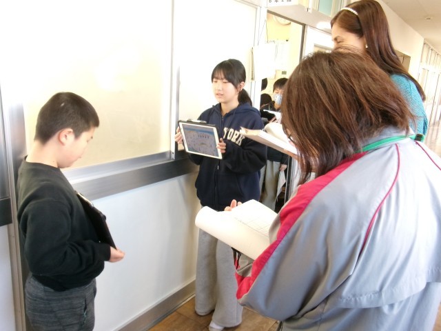 6年2組では、小学校での思い出をペアの子に英語で紹介していました。作った資料も一緒に見せながら、思い出に残った理由などを話していました。教室の中では、待つ子や準備を進める子がいました。
