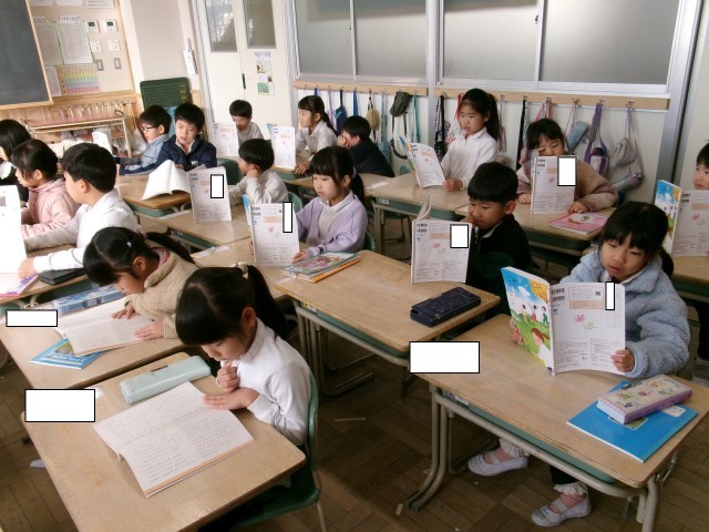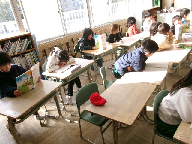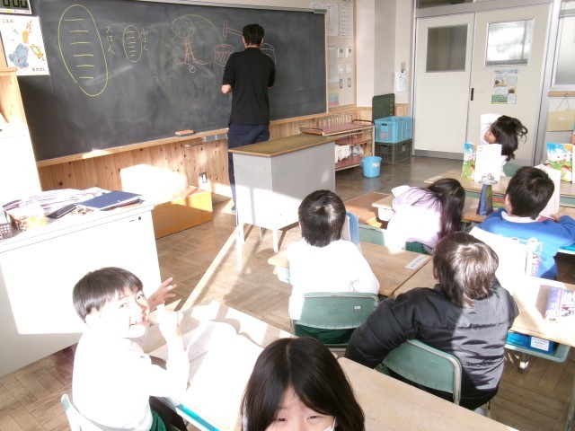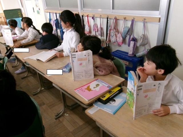 1年1組では、昔話を読んでいました。教師が情感豊かに読み聞かせ、子どもたちは聞き入っていました。途中、「かまど」など難しい言葉が出ると、教師が黒板に絵を描いて説明していました。