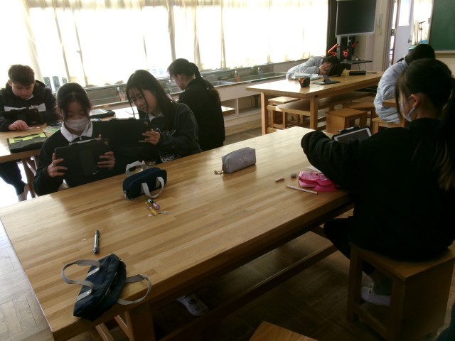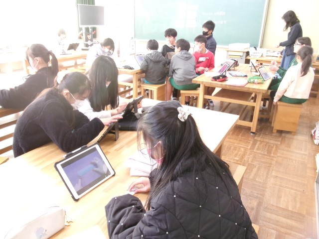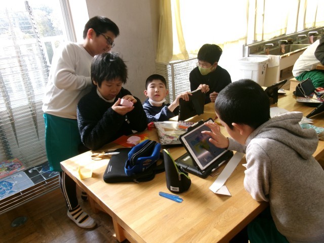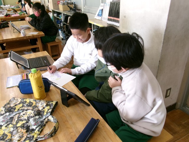 5年4組が図工室で「コマ送りで連続の動きの表現」の学習をしていました。絵を描いたり道具を動かしたりしたものをタブレットで撮って再生しながら動きを楽しんで表現していました。