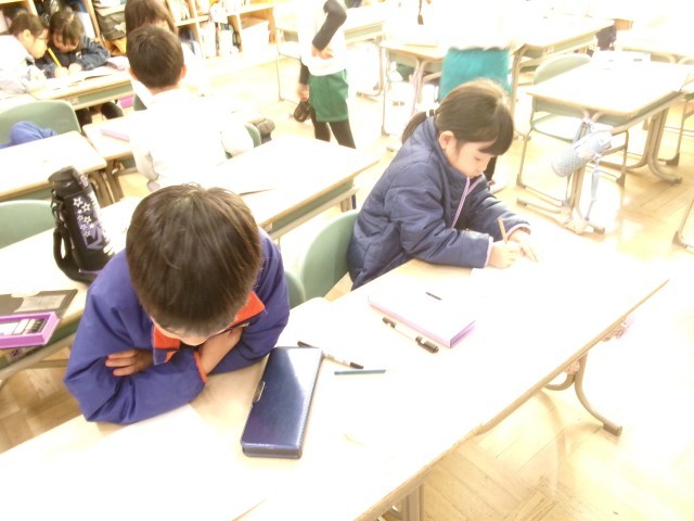 1年3組では、自分で考えたお話をワークシートに書いていました。「ももたろう」などを主人公にしながら楽しいお話を考えて書いていました。