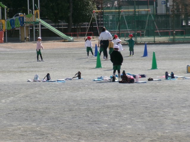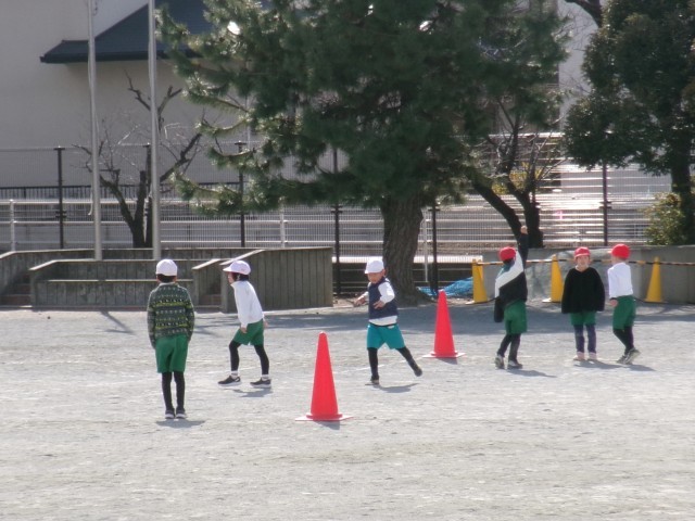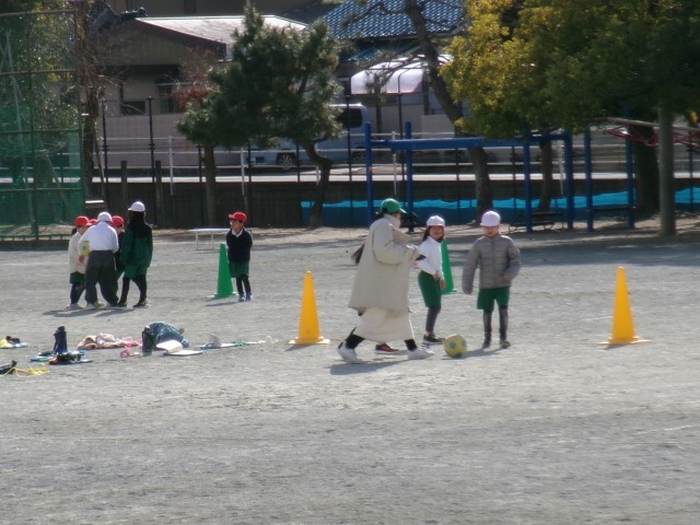 1年3組が運動場でラインサッカーをやっていました。チームに分かれて声を掛け合ってボールをけっていました。