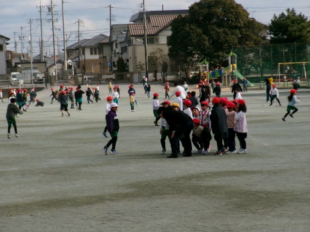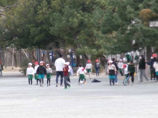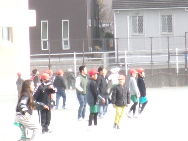 朝はかなり寒かったですが、昼放課に少し寒さも緩んできました。運動場では子どもたちが元気に遊んでいました。来客の方と遊んでいる子もいました。