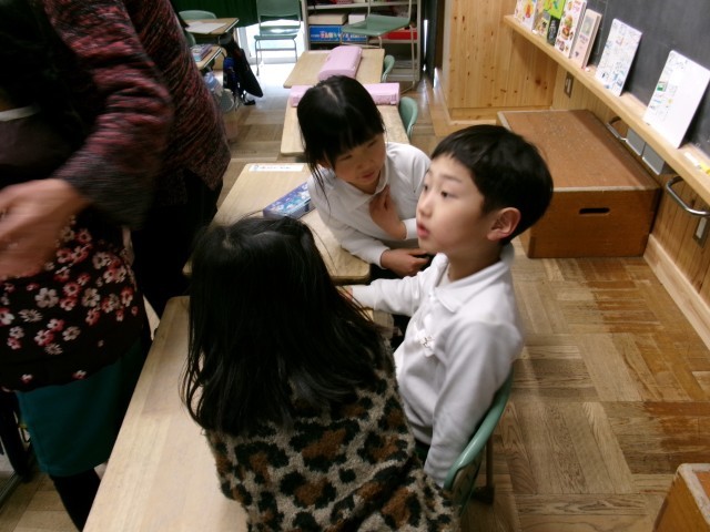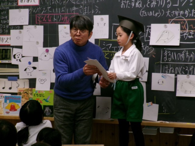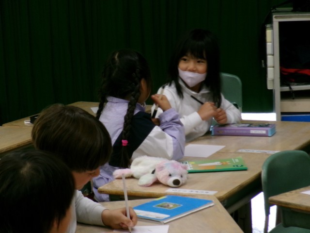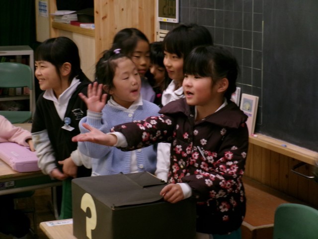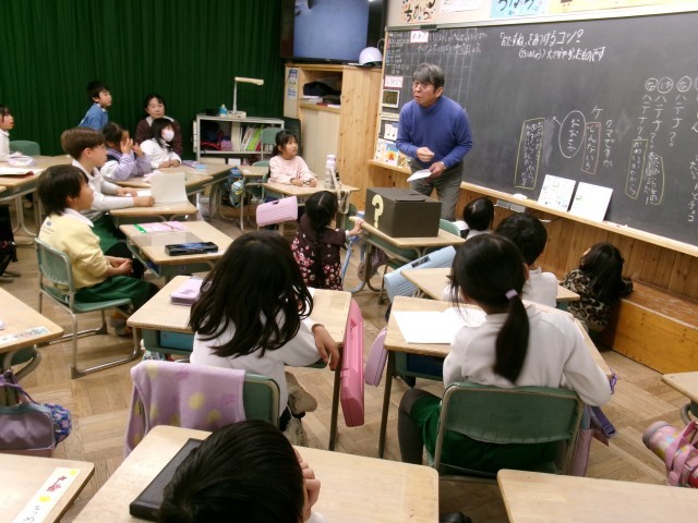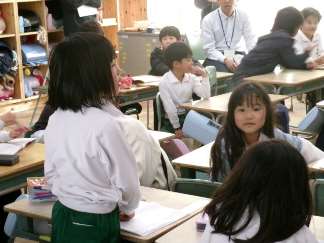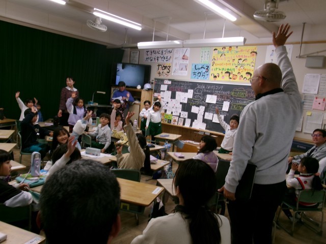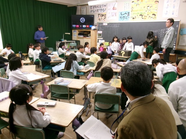 1年2組では、大学の先生にも来ていただき、「朝の会スペシャルバージョンを楽しもう」の公開授業が行われました。他校からも子どもたちの様子を見に来た教師も一緒に授業に参加しました。子どもたちは、家にあるものを「はてな」として発表したり、自分の調べたことを「博士」となって紹介したりしていました。大学の先生からは「友達は○○といったけど、なぜ」「多分○○だろう」と感じることが大切と教えていただき、今できなくてもそのうちできるようになろうと呼びかけていただきました。子どもたちは、友達の意見を「へえ」とか「何だろう」など反応しながら一生懸命聞いていました。