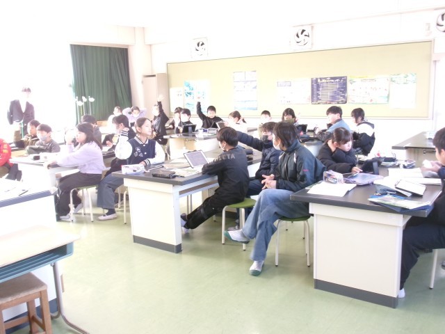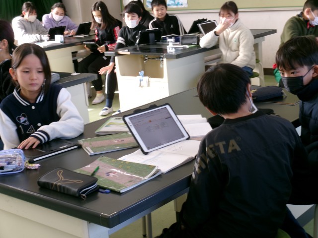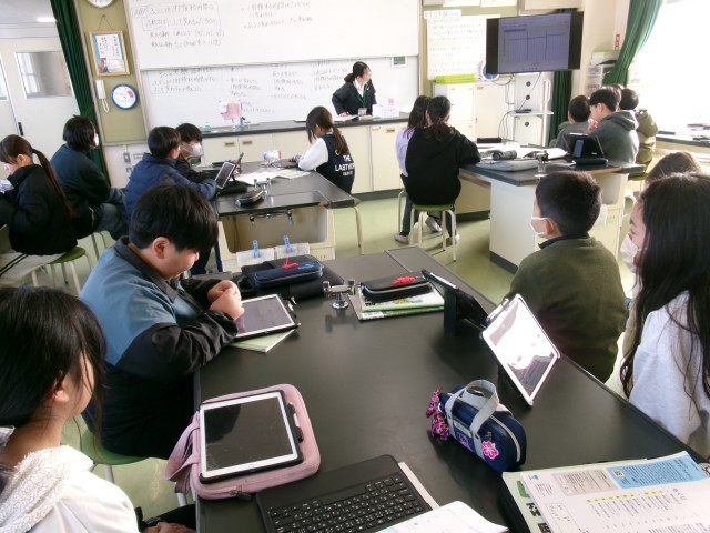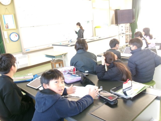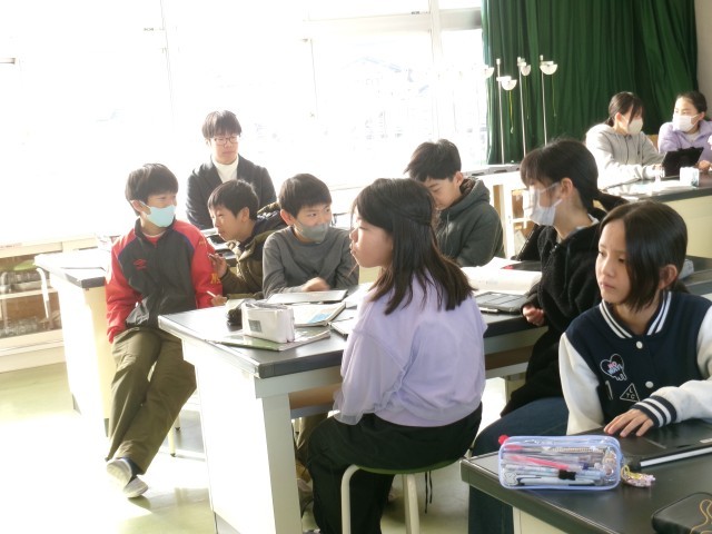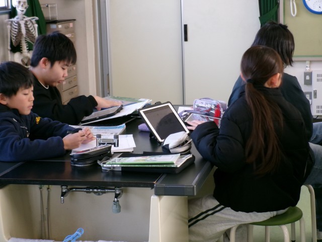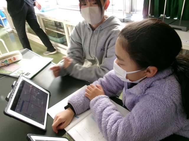 5年1組が理科室で、振り子の学習をしていました。実験結果を見ながら、振り子の速度が変わる条件を一生懸命考えていました。