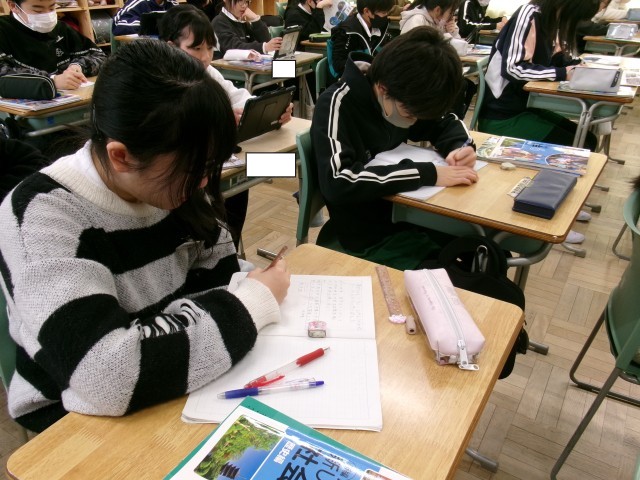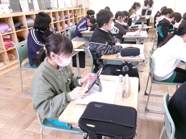 6年3組では、社会で「なぜ日本は国家予算の1/3をかけてオリンピックを行ったのか」について考えていました。「経済」「外交」「国民の気持ち」の項目に分けて調べたことをノートに書いていました。