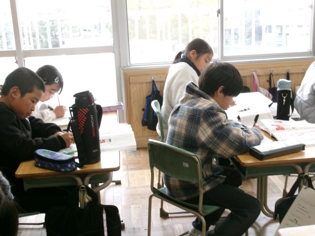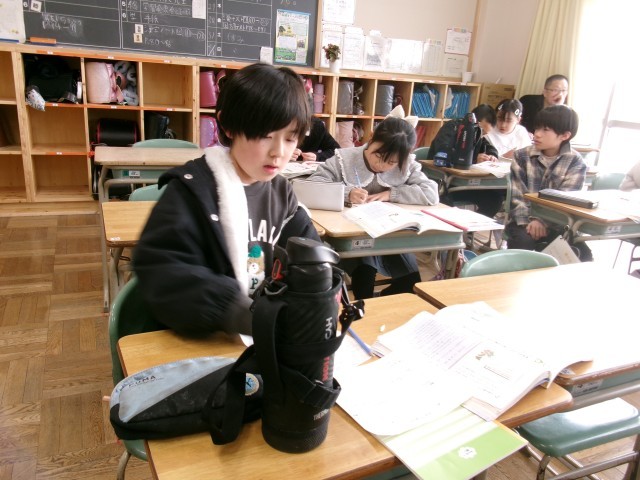 4年2組では、国語で「自分ならどちらを選ぶか」の学習をしていました。理由の書き方を学んだ後、一人一人ノートに書いて教師に見せていました。