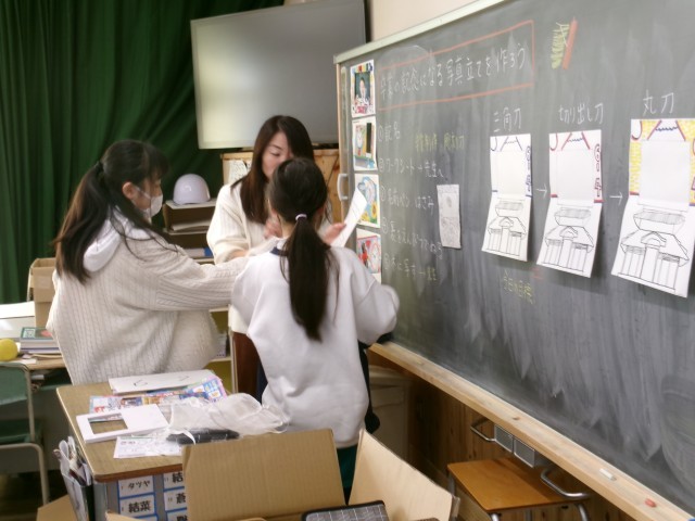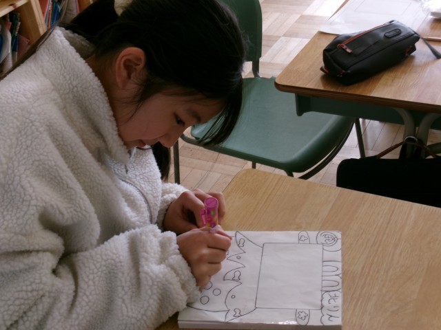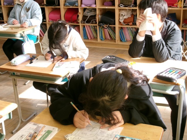 6年2組では、卒業記念の写真縦のデザインを考えていました。春らしい花を彩ったもの、卒業証書を入れたものなど工夫してかいていました。