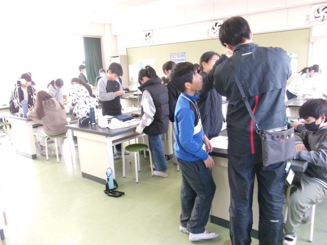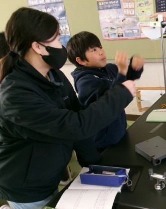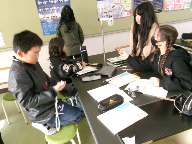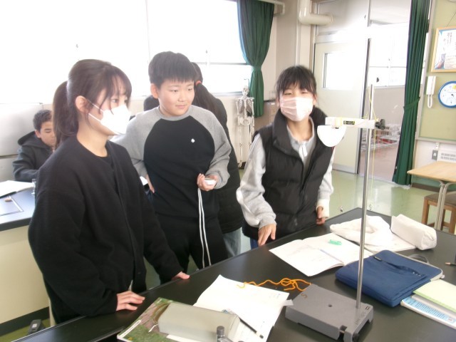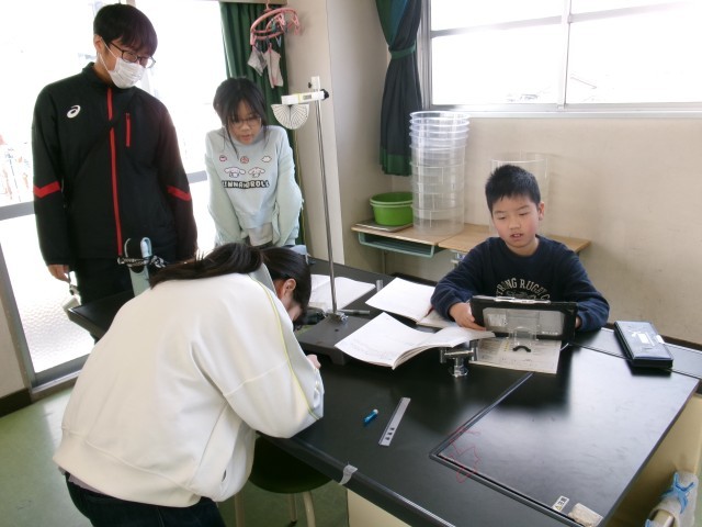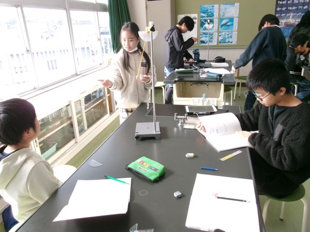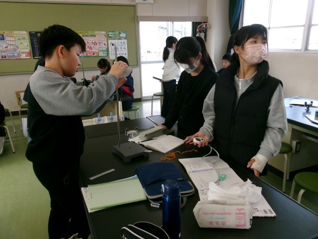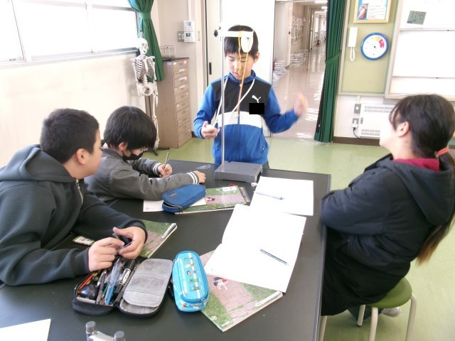 5年2組が、理科室でふりこの実験をしていました。班ごとに条件を変えて、ストップウォッチで時間をはかっていました。みんな真剣に振り子の様子を見ていました。